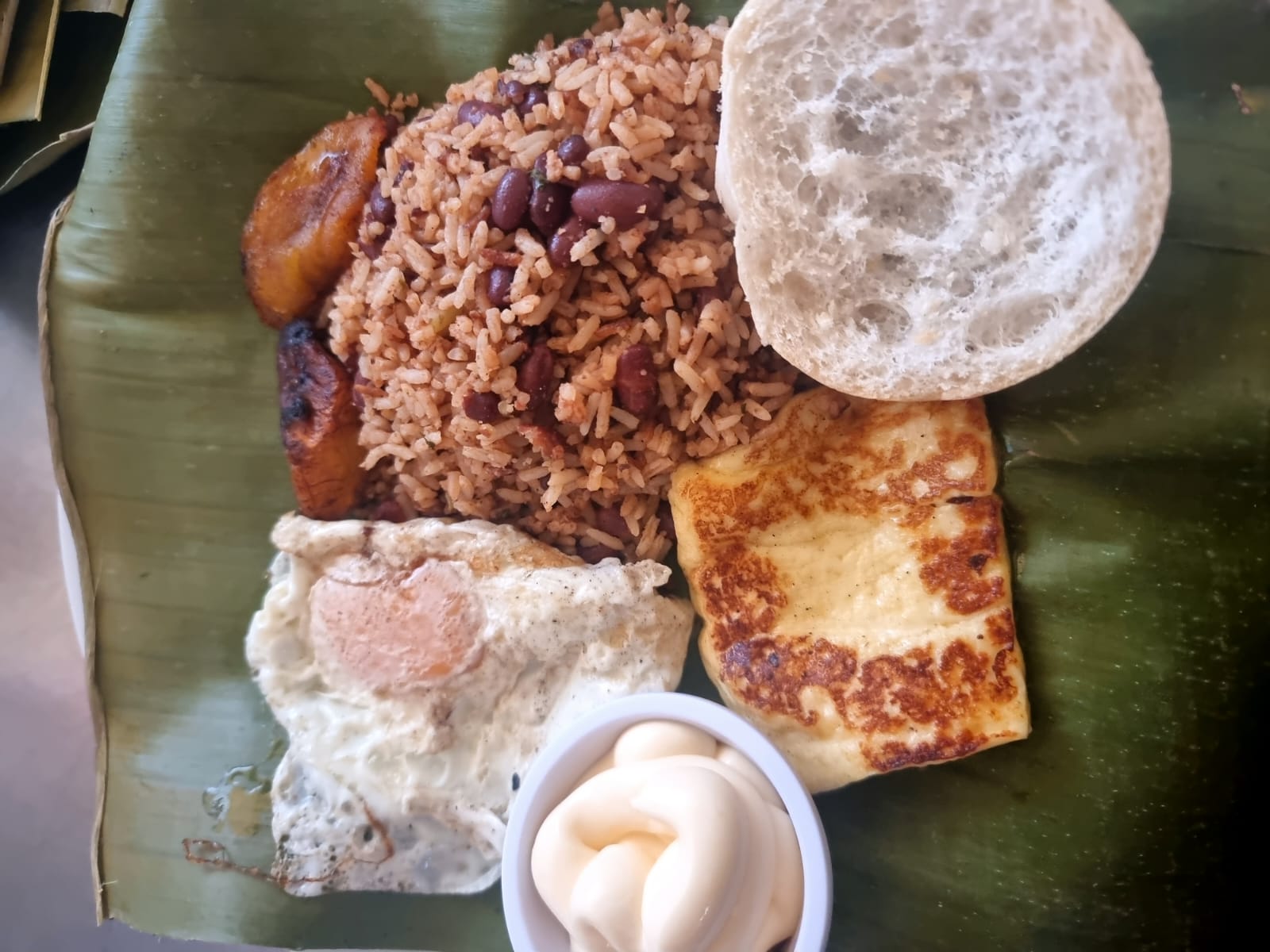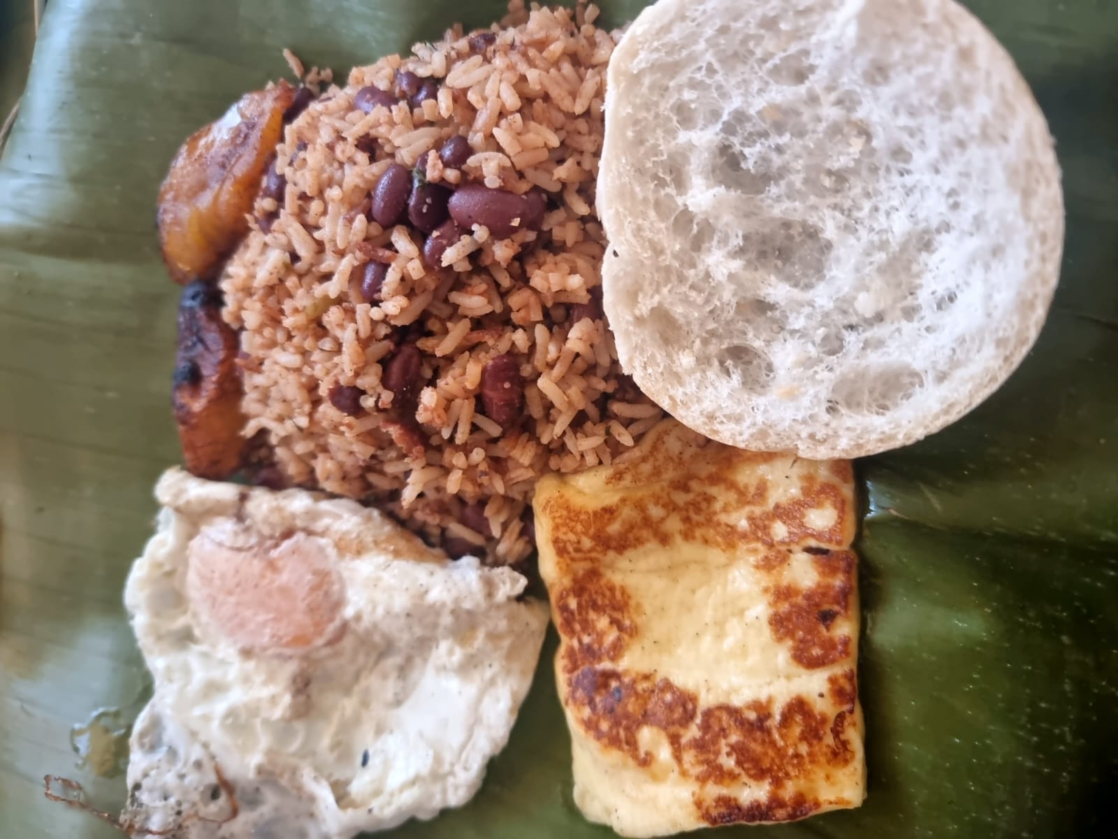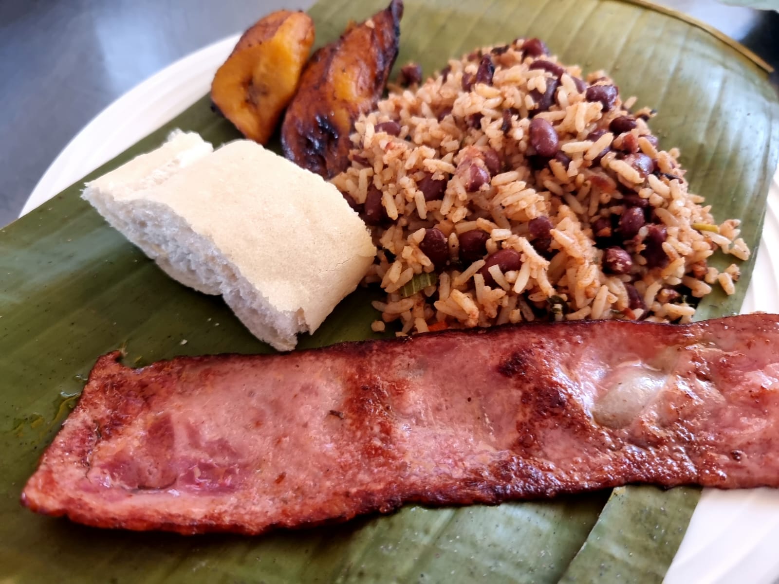 Gallo pinto con maduro, pan y a escoger 1 proteína