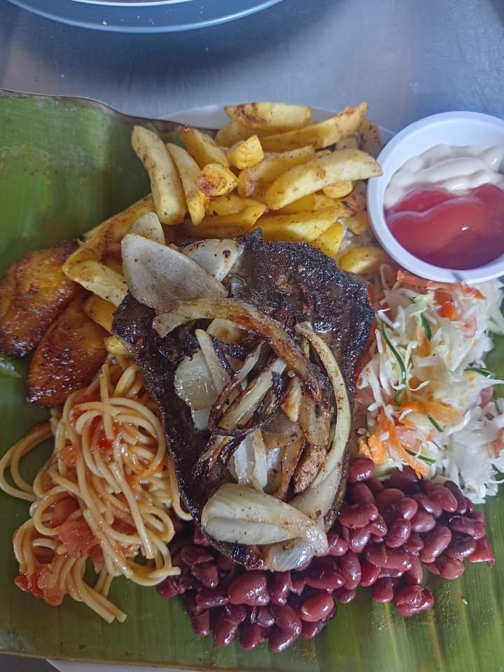 Pinto, chuleta, huevo frito, papa fritas, ensalada verde, maduros,bebida de casa