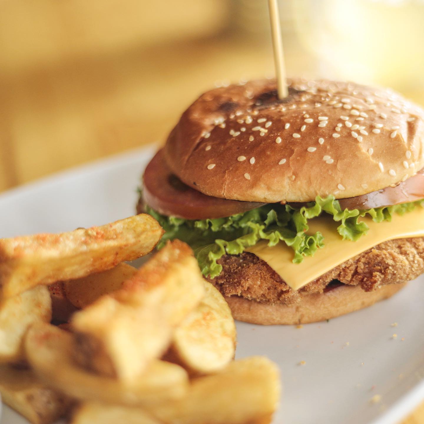 Filet de pescado empanizado, queso, tomate, lechuga, salsa tártara y papas fritas.