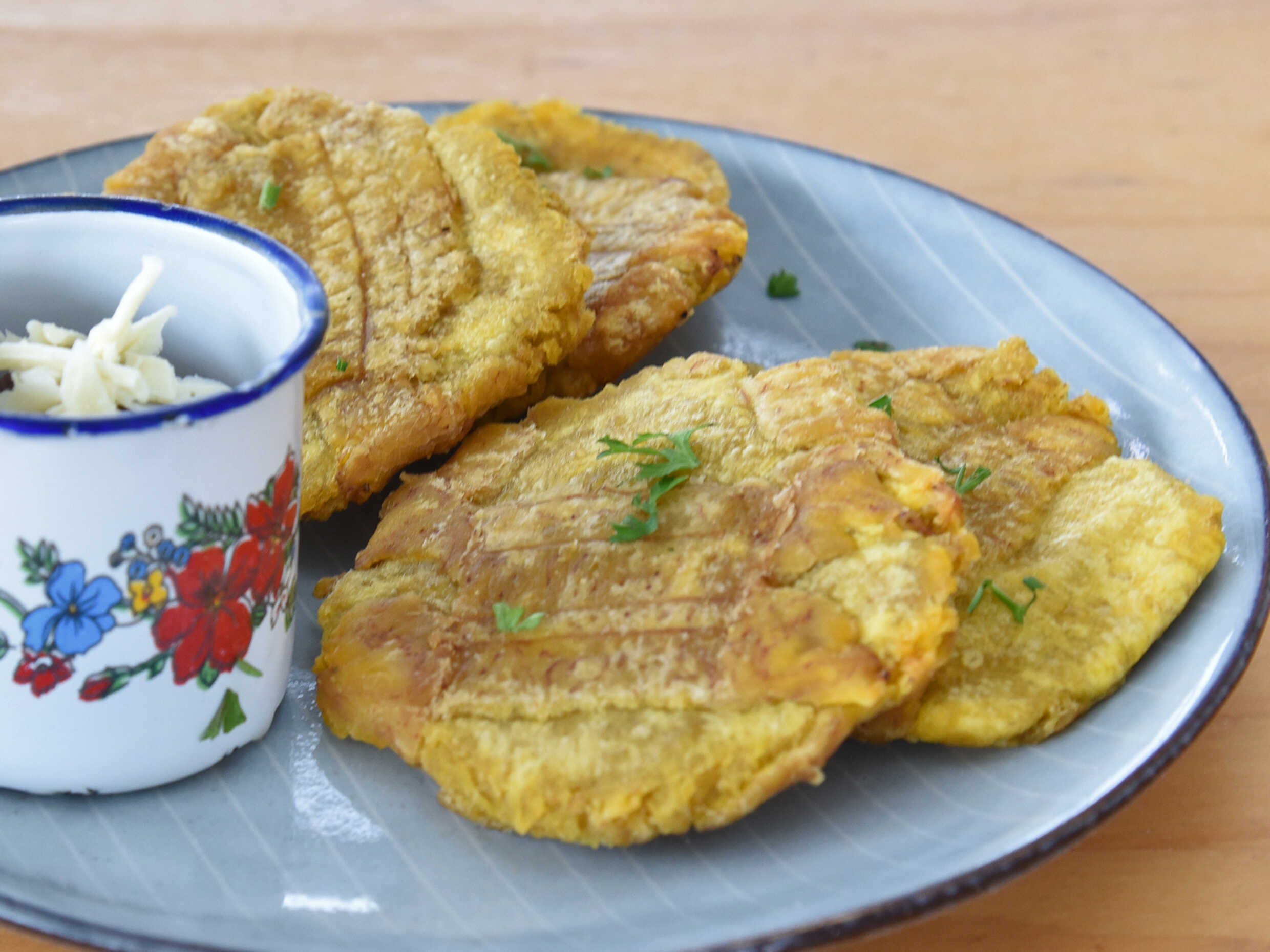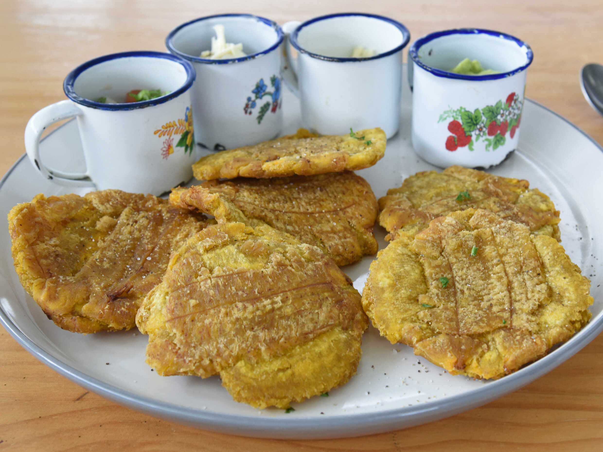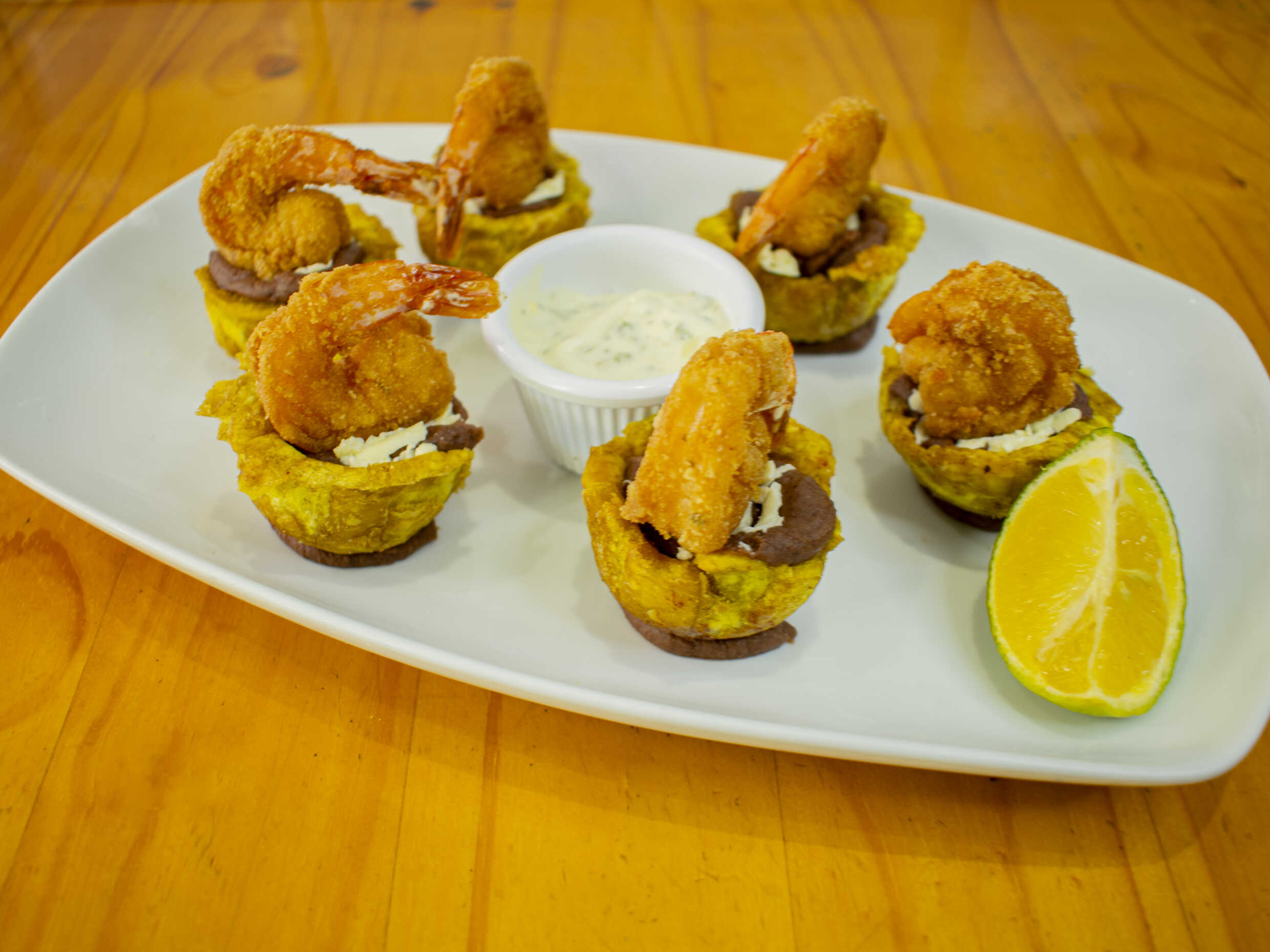 6 Patacones acompañados de salsa tártara, frijoles molidos, pico de gallo y guacamole.