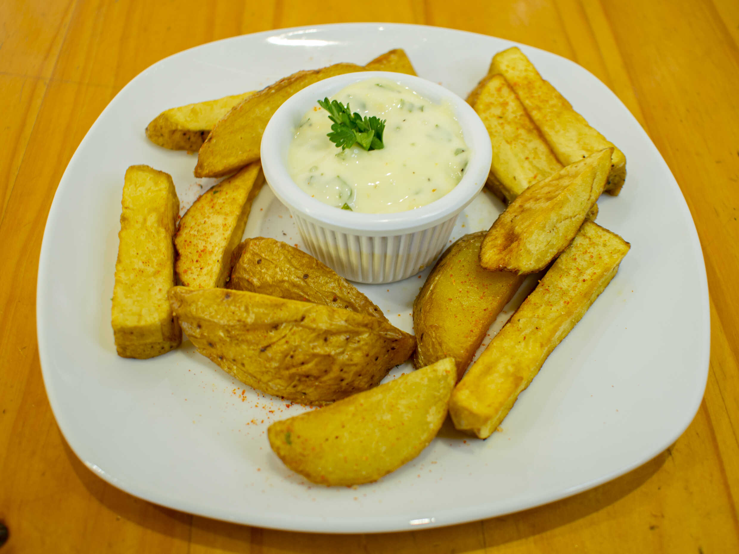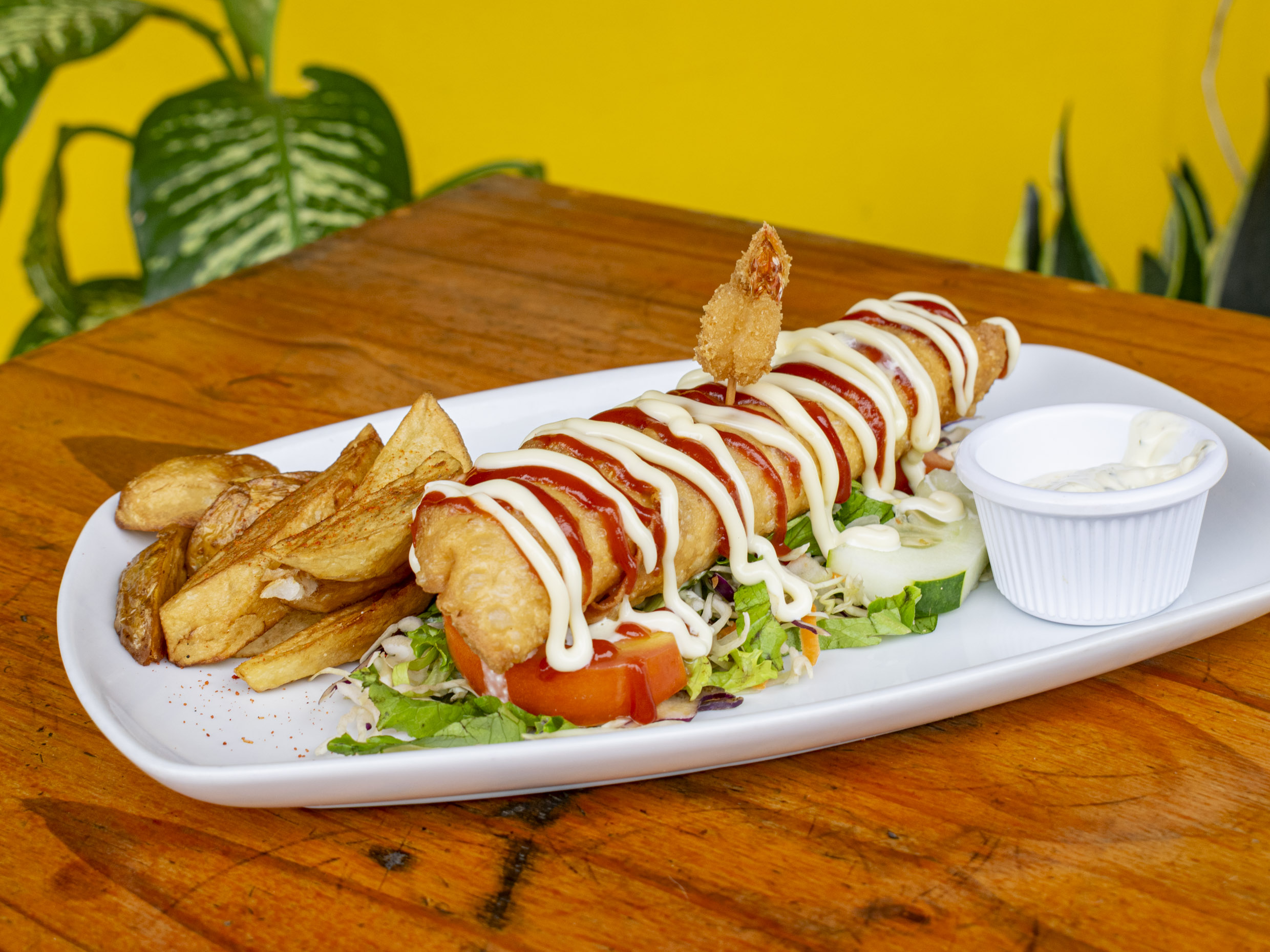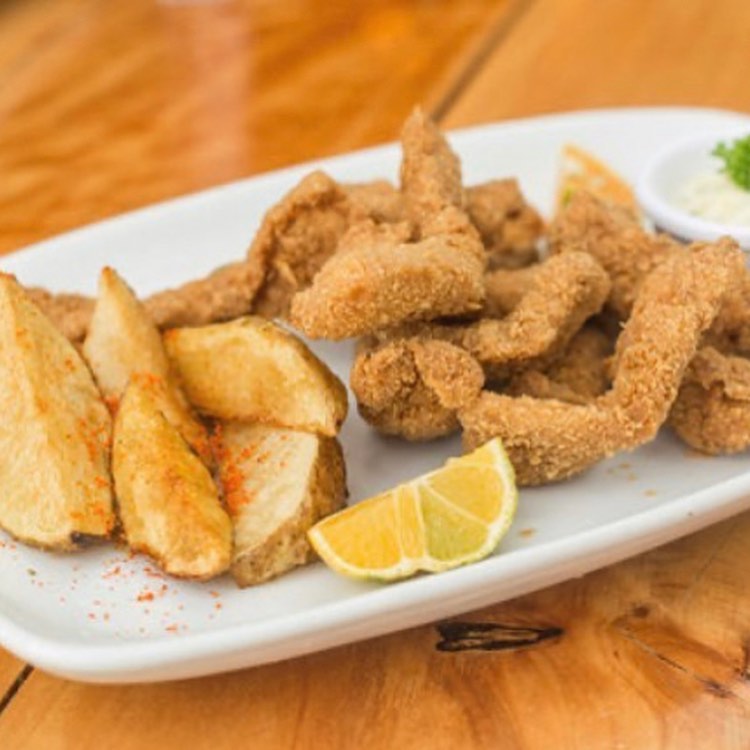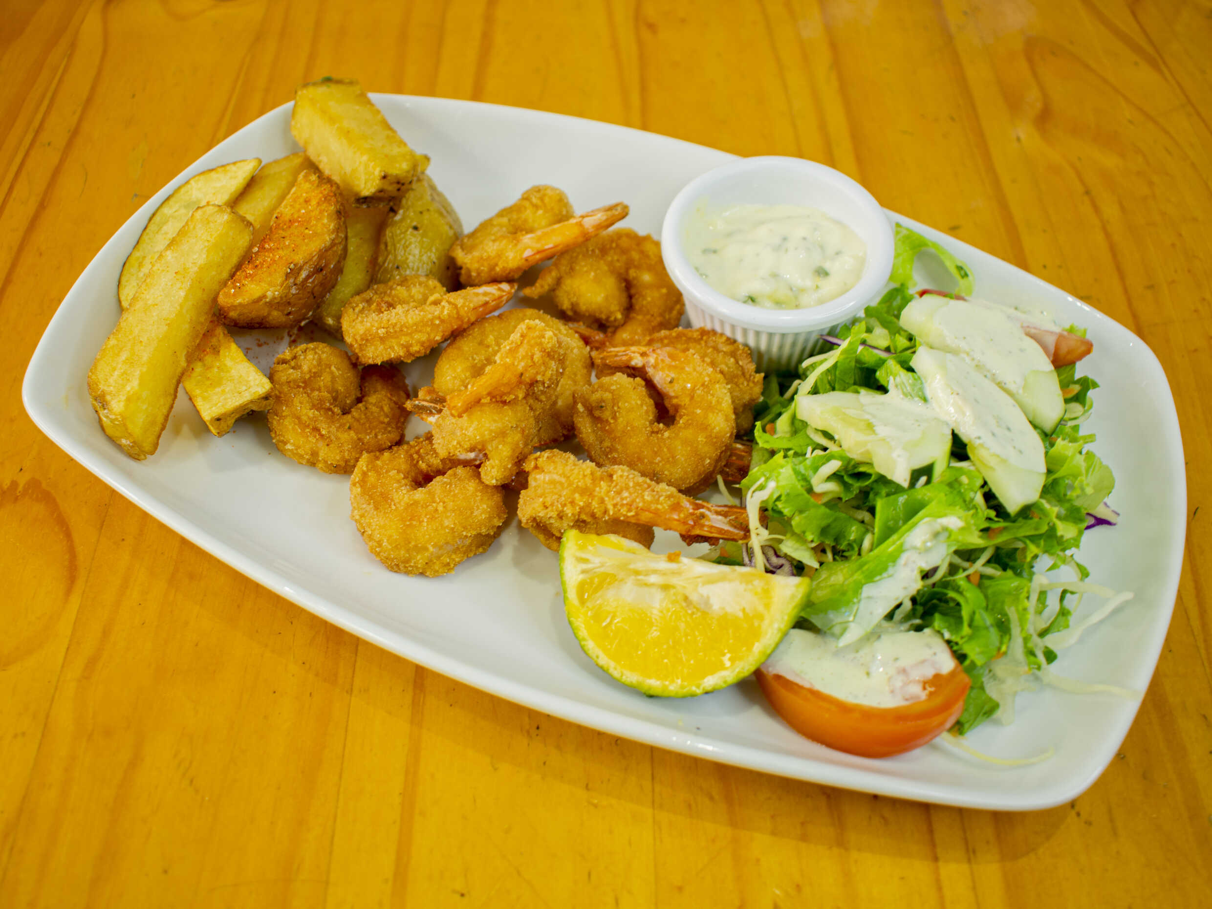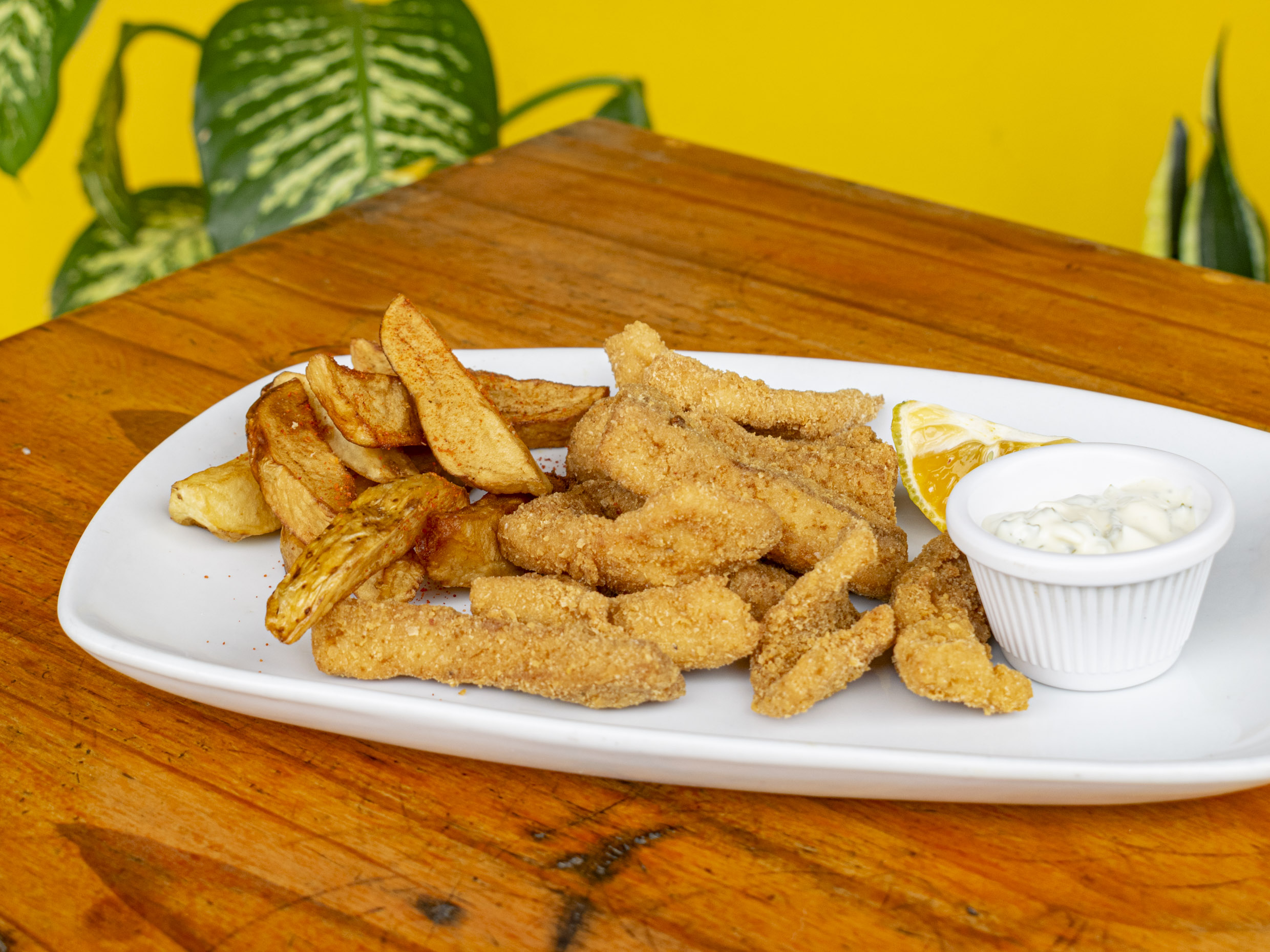 Acompañado de papas de la casa, ensalada y salsa tártara.