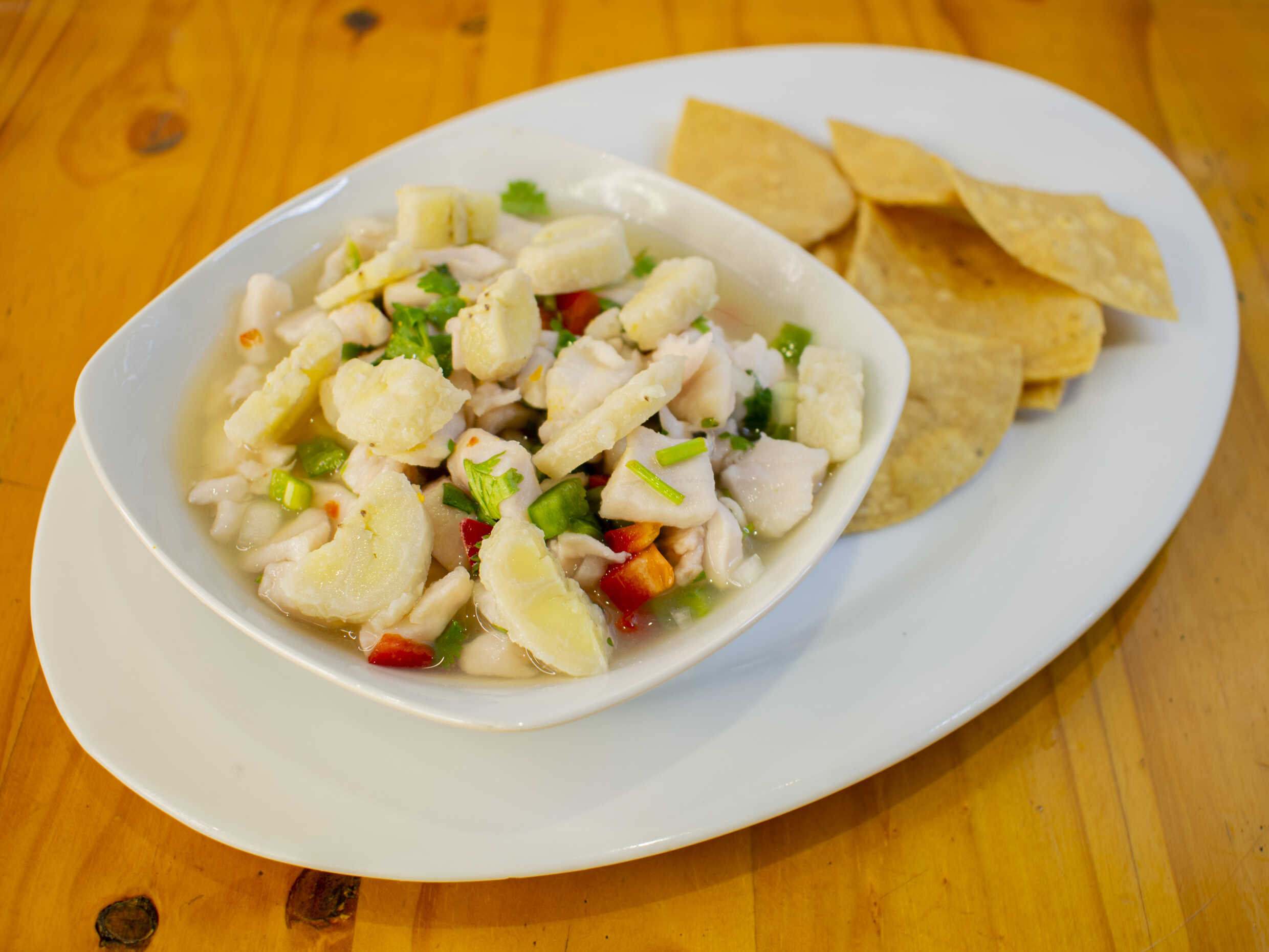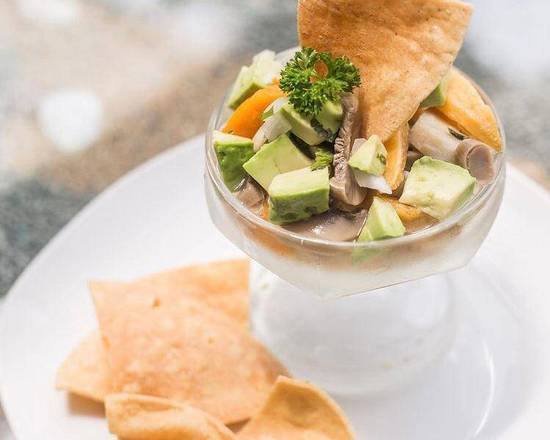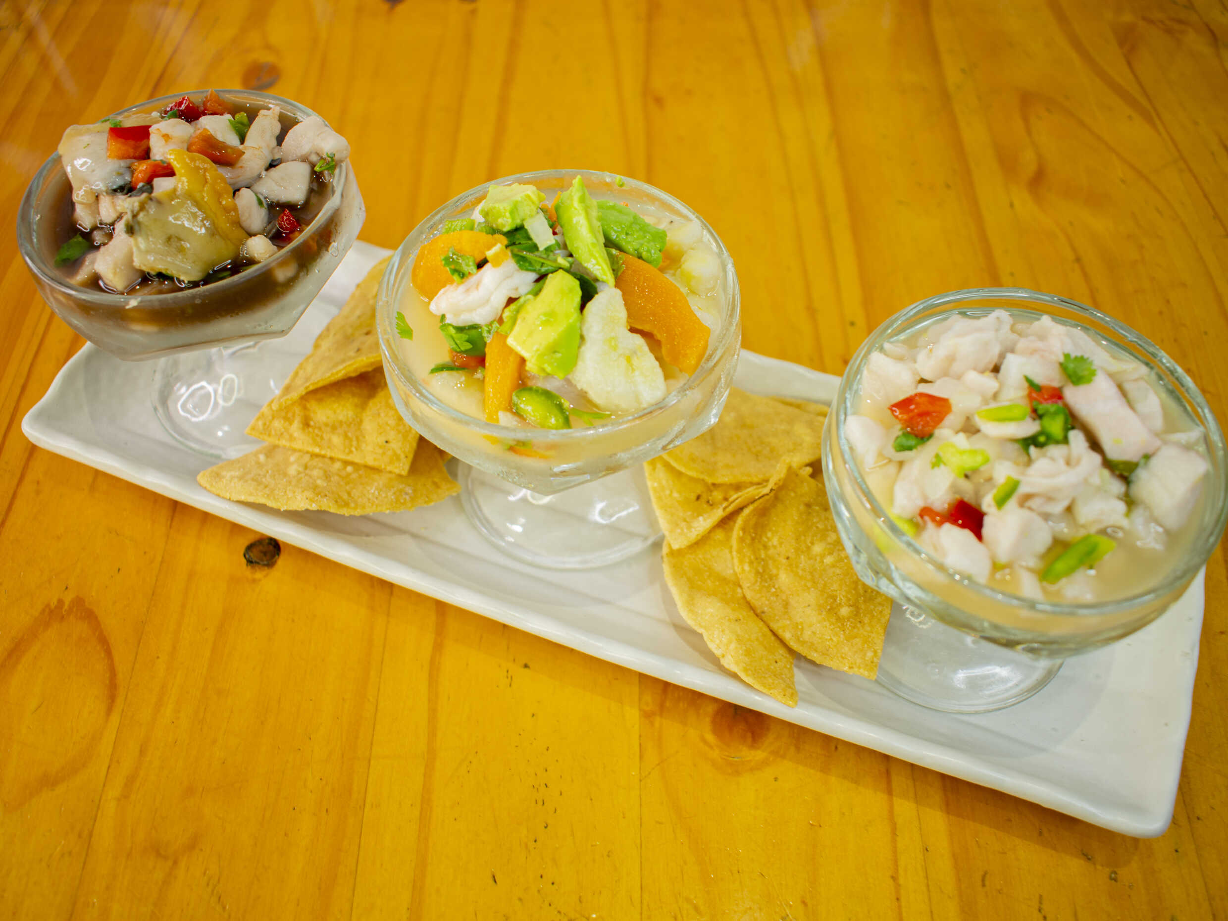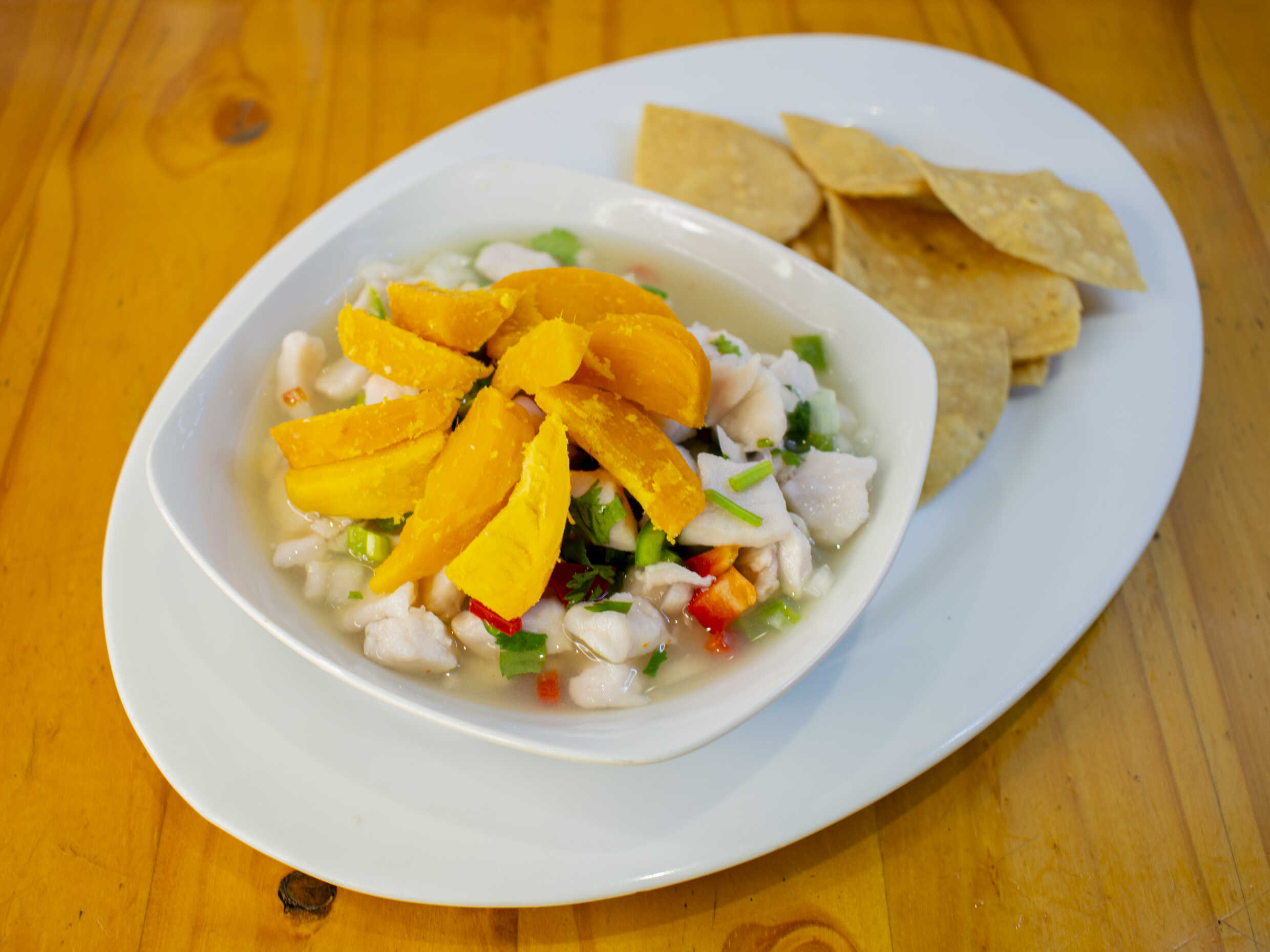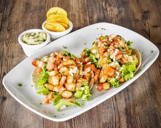 Pescado, camarón, banano, pejibaye y aguacate. Acompañado de chips.