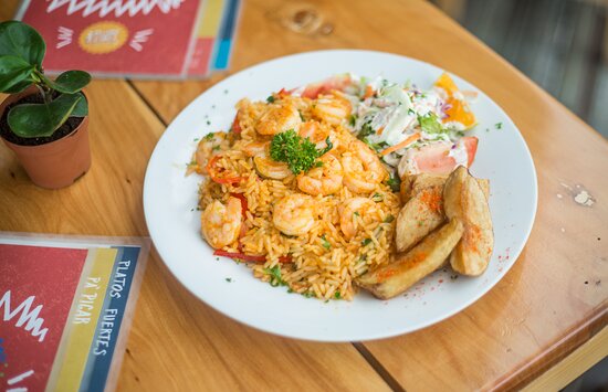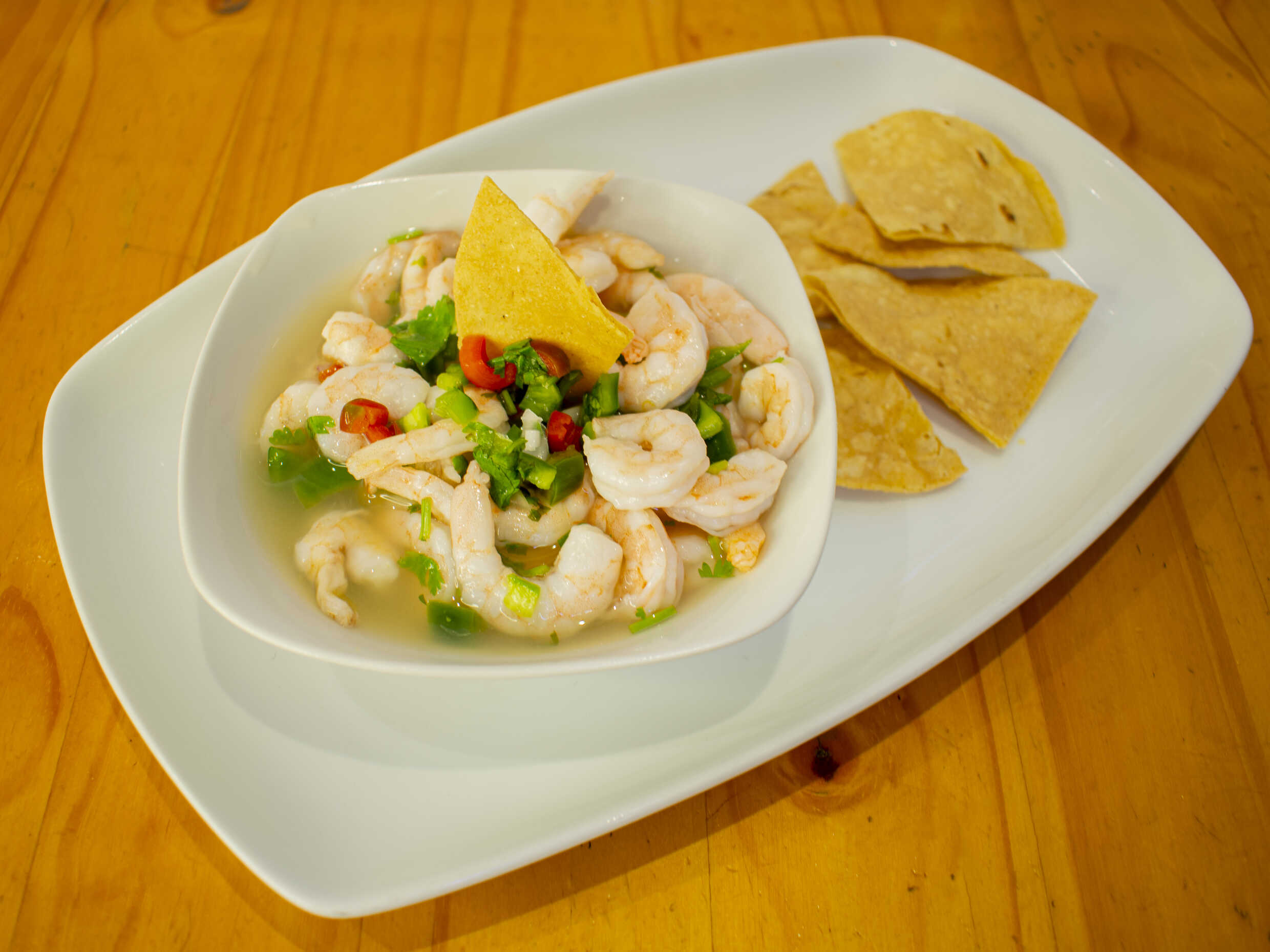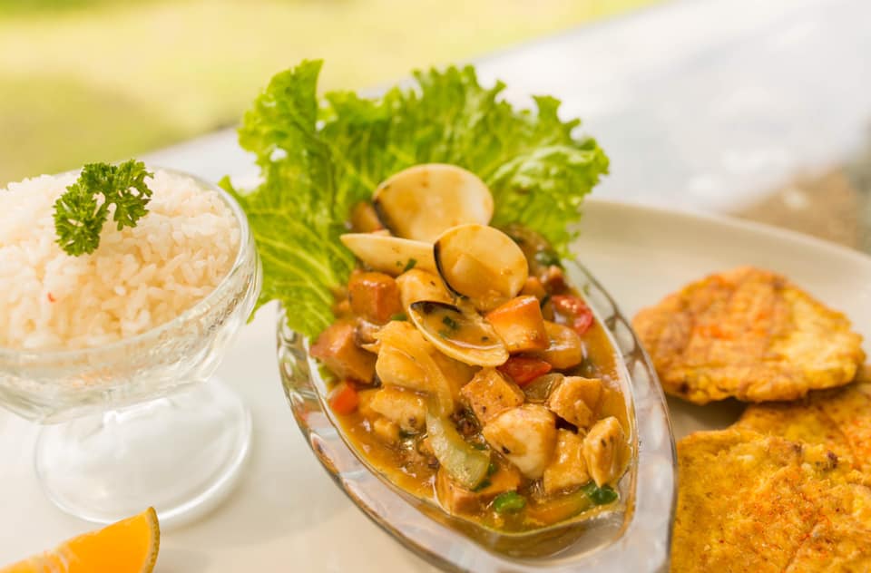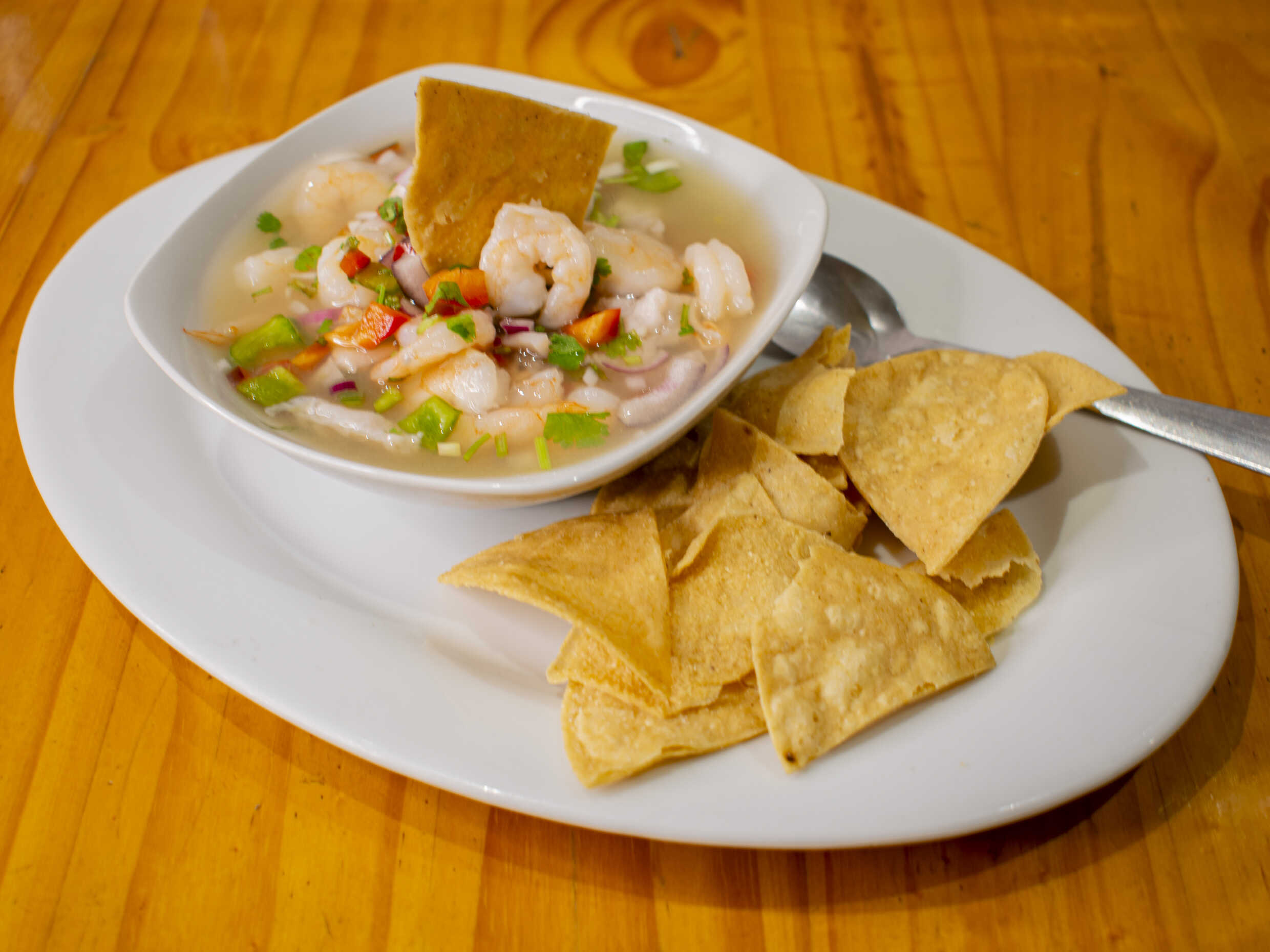 Pescado, camarón, banano, pejibaye y aguacate. Acompañado de chips.