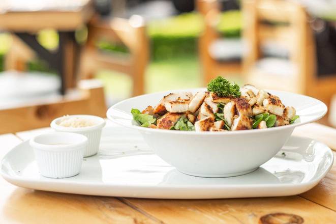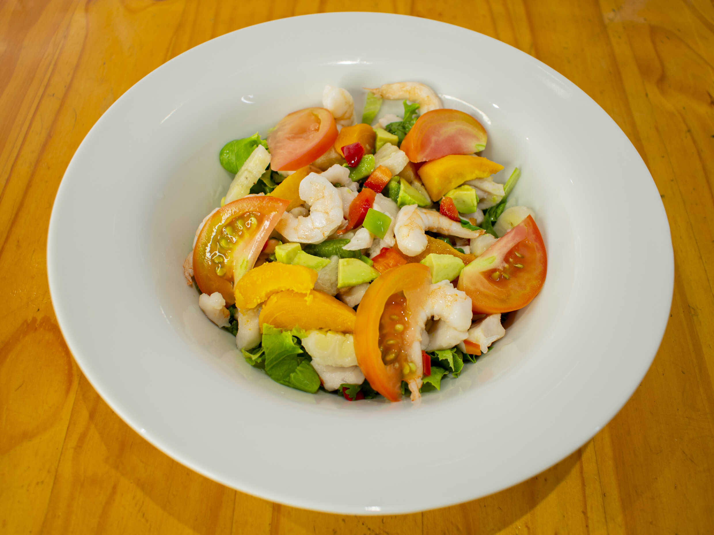 Cama de lechuga y espinaca, pejibaye, banano verde, pescado, camarón o mixto. Acompañado de chips.