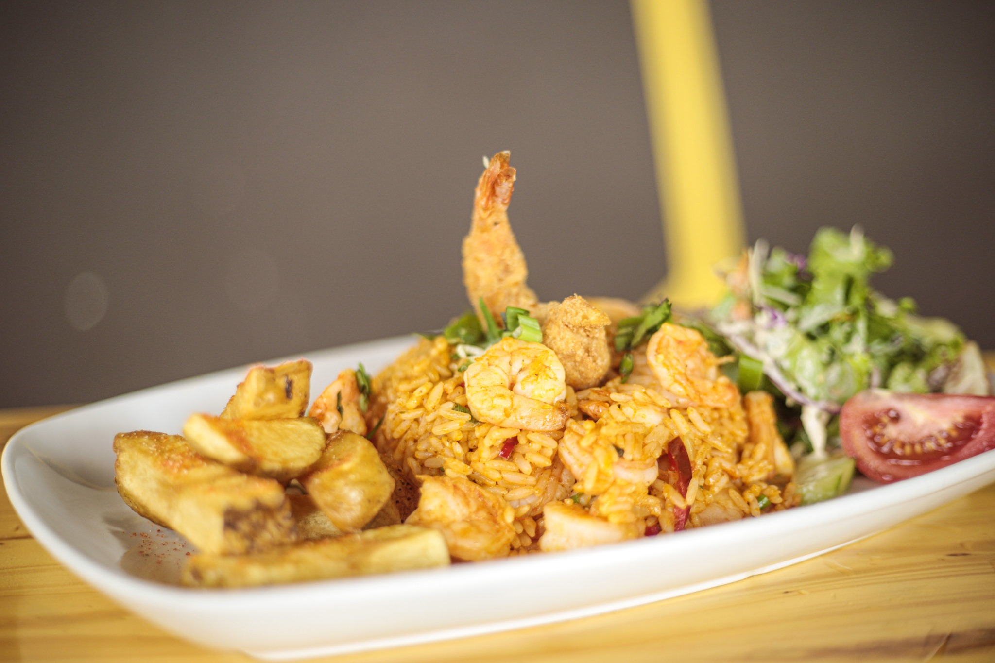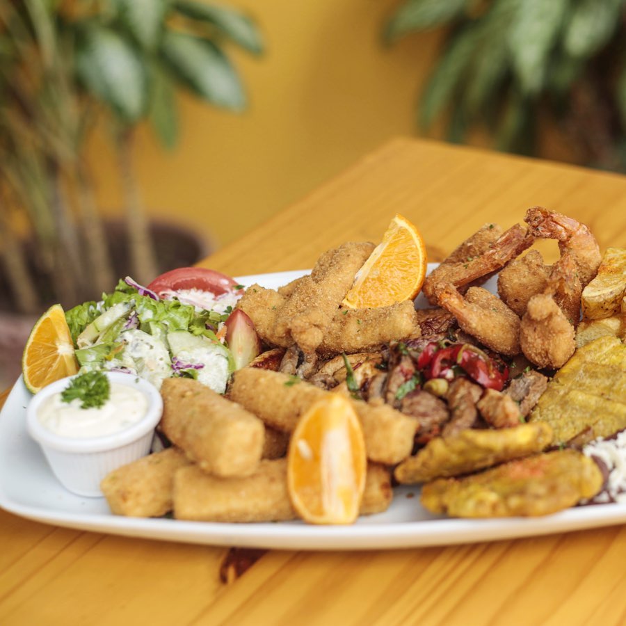 Camarones empanizados, dedos de pescado, aros de calamar, fajitas de res y pollo, patacones, papas fritas y ensalada.