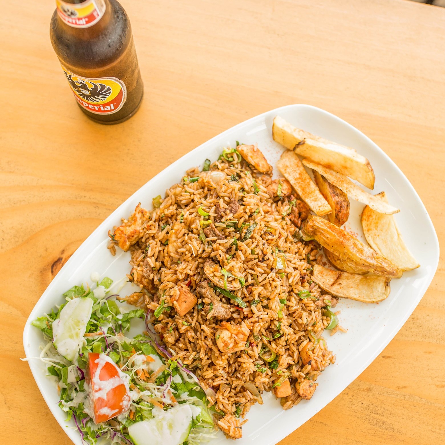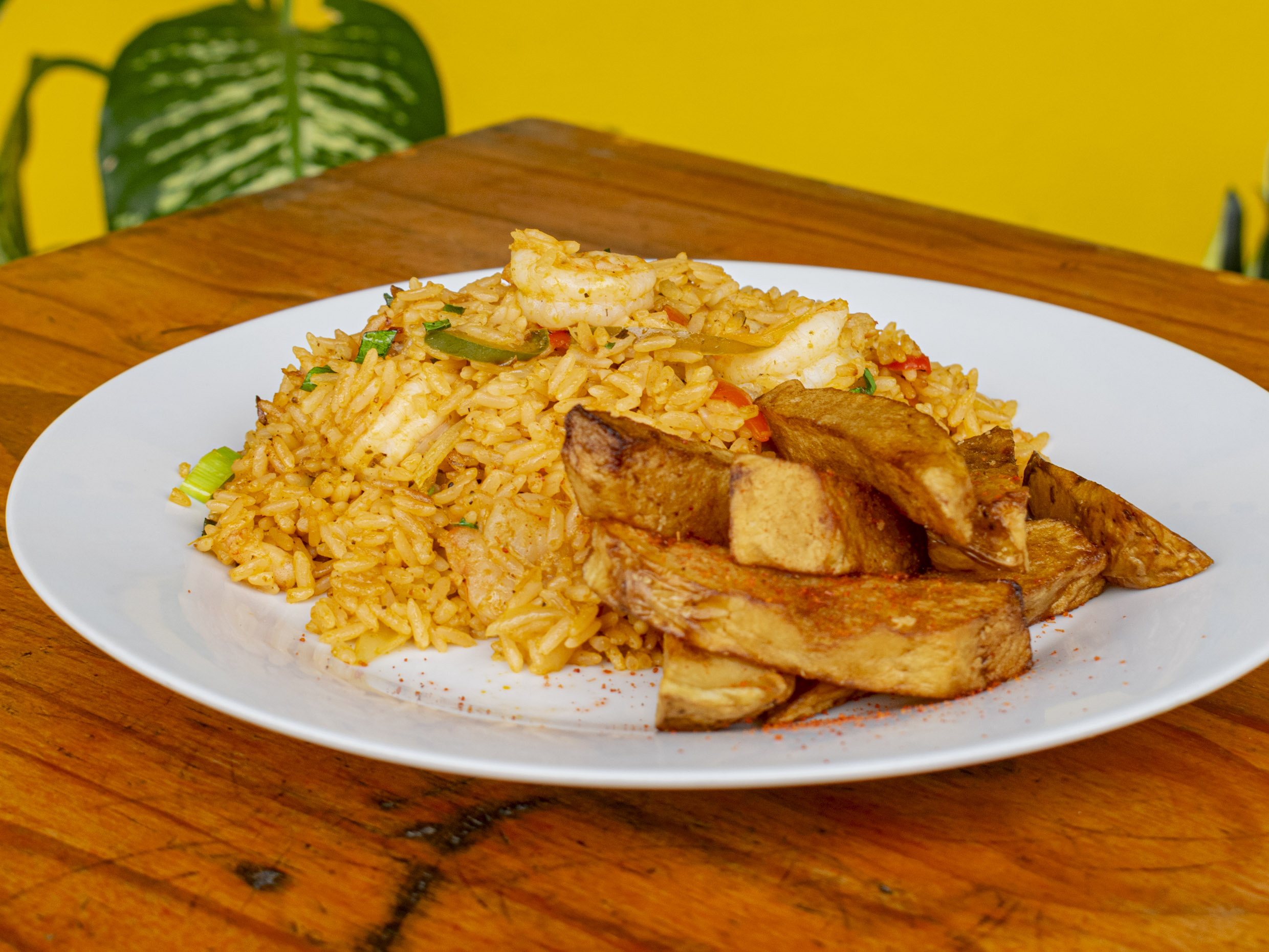 Almuerzo Ejecutivo personal: Delicioso arroz servido con 100 g de proteína a elección, acompañado de ensalada de la casa, 80 g de papas fritas y un refresco natural de 12 onzas (sabor según disponibilidad en tienda).