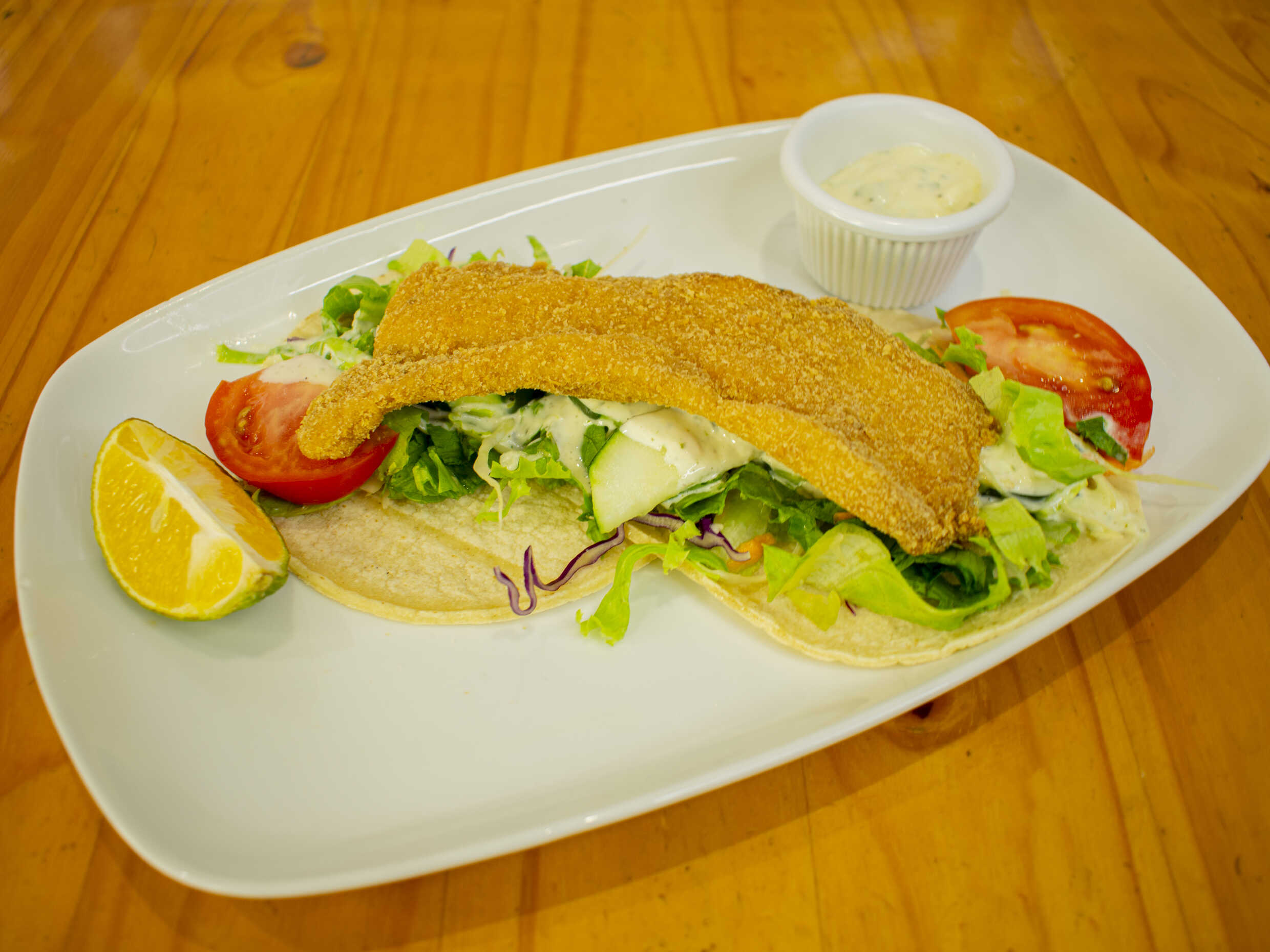 Dos tortillas de maíz, ensalada y 80 g de pescado empanizado.