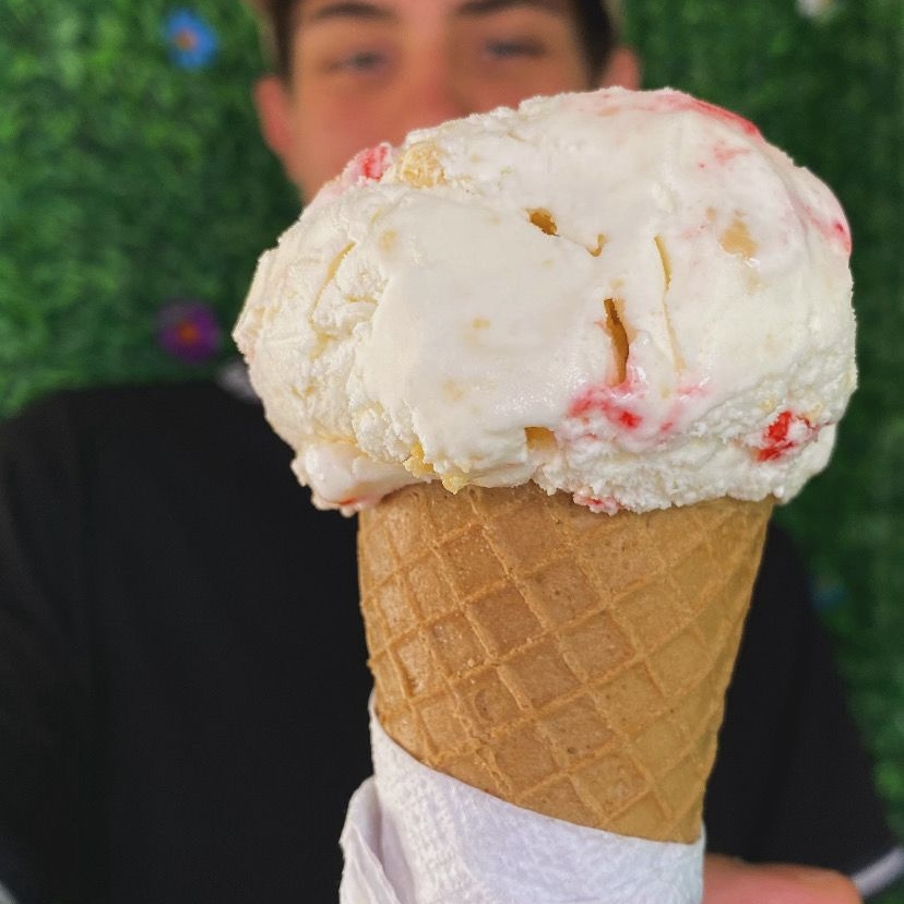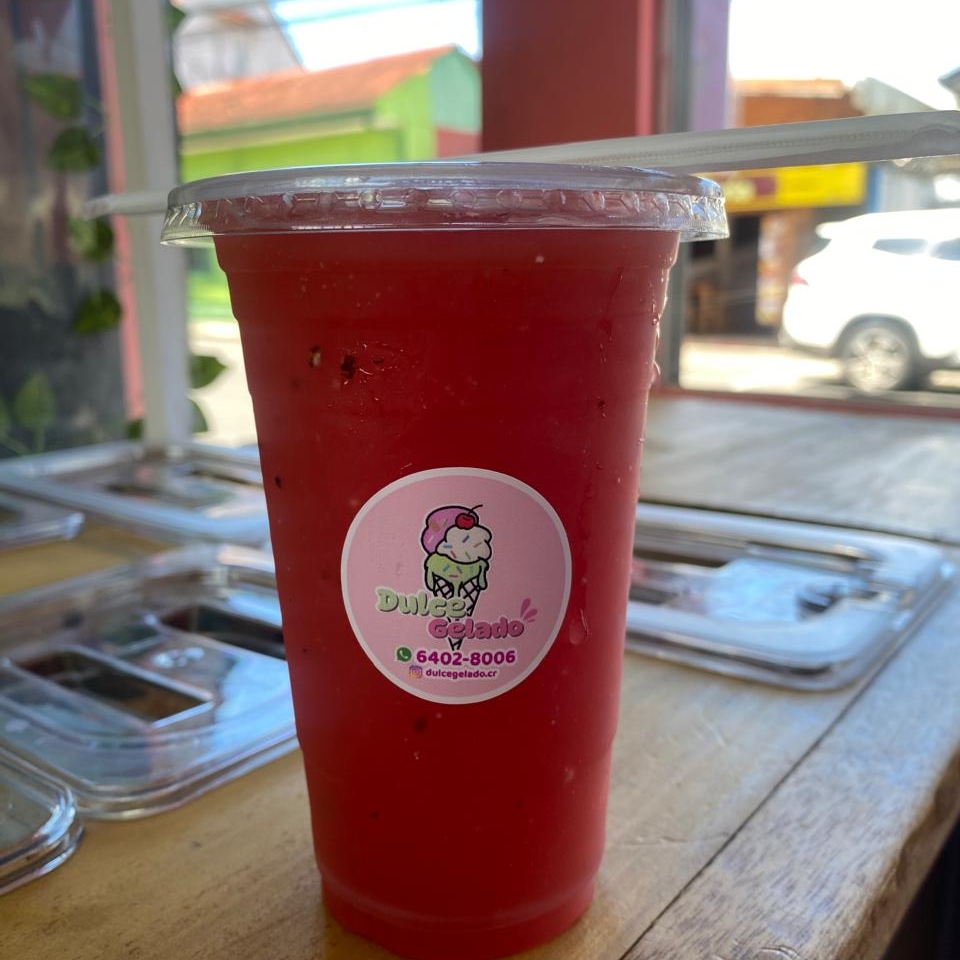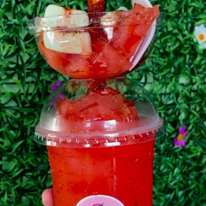 1 base de preferencia con fresa con melocotón, 1 jarabe, 2 topping y chantilly con 1 sabor de helado.
