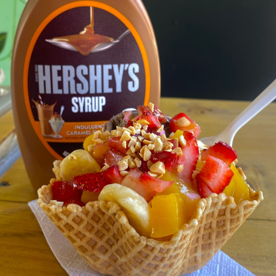 canasta comestible , 3 frutas a elegir , 1 jarabe , 1 topping y un sabor de Helado