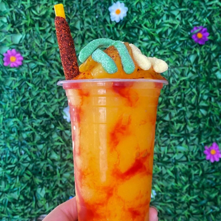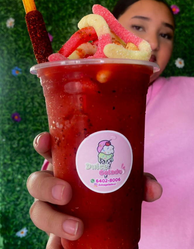 trozos de fresa, Chamoy Tajín, Gomitas de gusano, pajilla de tamarindo