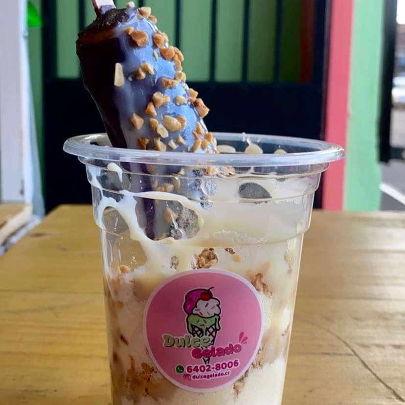 Un delicioso banano cubierto de chocolate con leche pinito, leche condensada crema y un topping a tu preferencia.