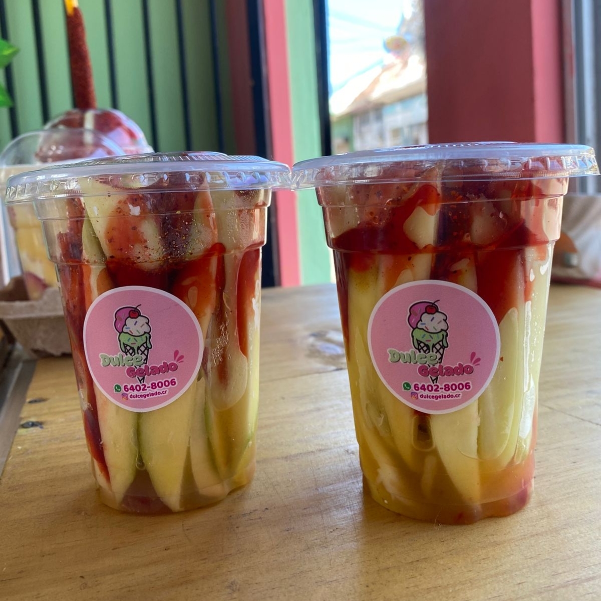 Nieve de mango más trozos de mango más chamoy más Tajín más gomitas.