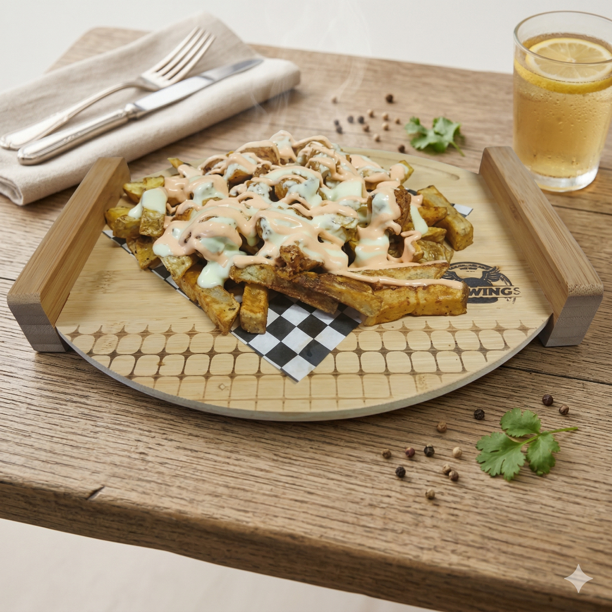1 papa con pollo (Papas fritas naturales, strips de pollo crispy, mayonesa de la casa y salsa futwings) 1 gaseosa o tropical 250ml