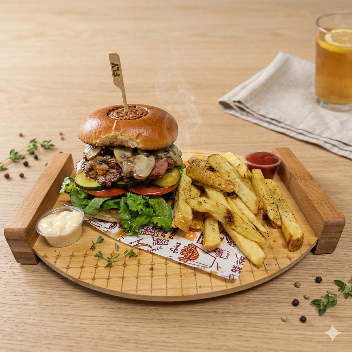 1 honey mustard burger (Pan artesanal de la casa, lechuga, tomate, pepinillos, torta smash 100% carne de res, queso, tocino, cebolla y hongos caramelizados, most 1 orden papas fritas naturales 1 refresco según disponibilidad de 250ml