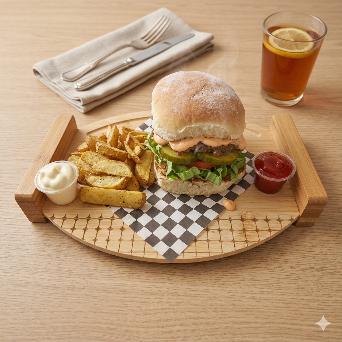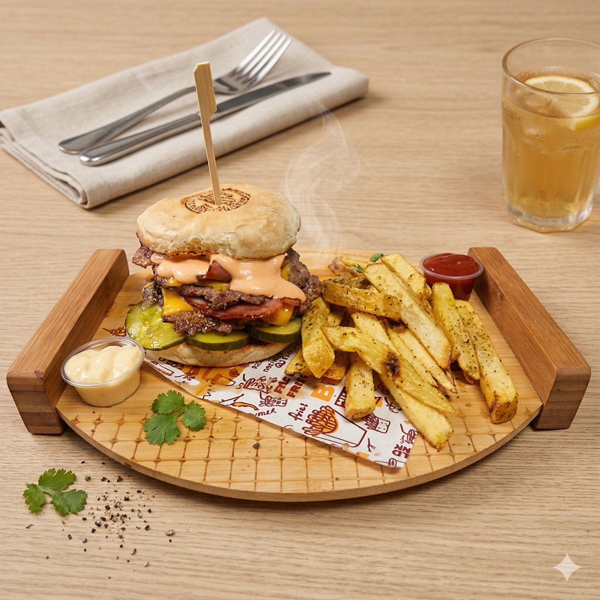 1 Texan burger (Pan artesanal de la casa, lechuga, tomate, pepinillos, torta smash 100% carne de res, queso,tocino, cebollita crispy, mayonesa y bbq) 1 orden papas fritas naturales 1 refresco según disponibilidad de 250ml