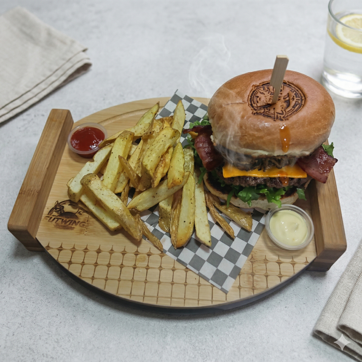 1 Quesoburguesa doble futwings (Pan artesanal de la casa, lechuga, tomate, pepinillos,2 tortas smash 100% carne de res, 2 rebanadas de queso, 2 rebanadas de tocino, salsa futwings) 1 orden papas fritas naturales 1 refresco según disponibilidad de 250ml