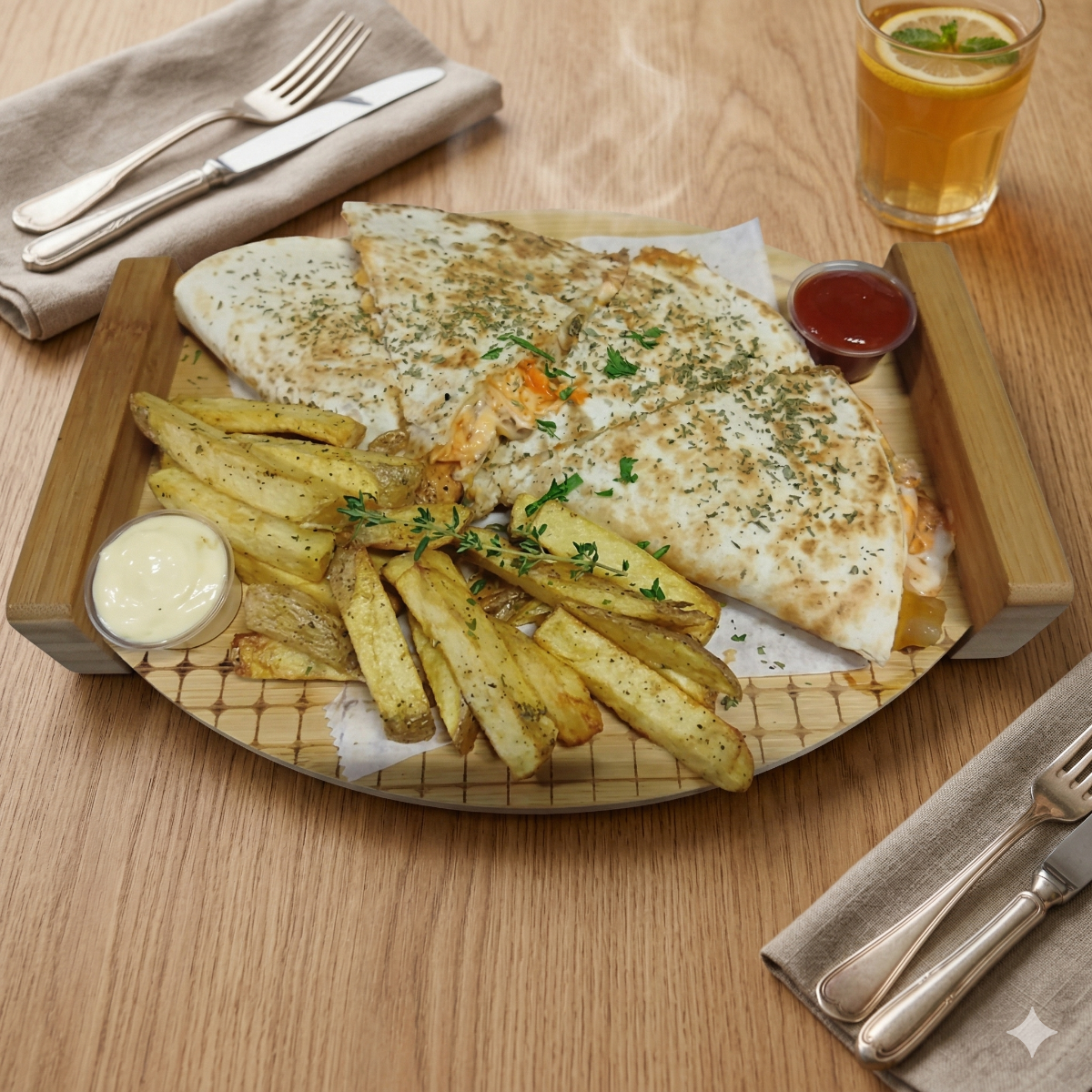 1 Quesadilla pollo (Tortilla harina 12", mix queso mozarella y cheddar, strips pollo crispy, salsa futwings y ranch) 1 orden papas fritas naturales 1 refresco según disponibilidad de 250ml
