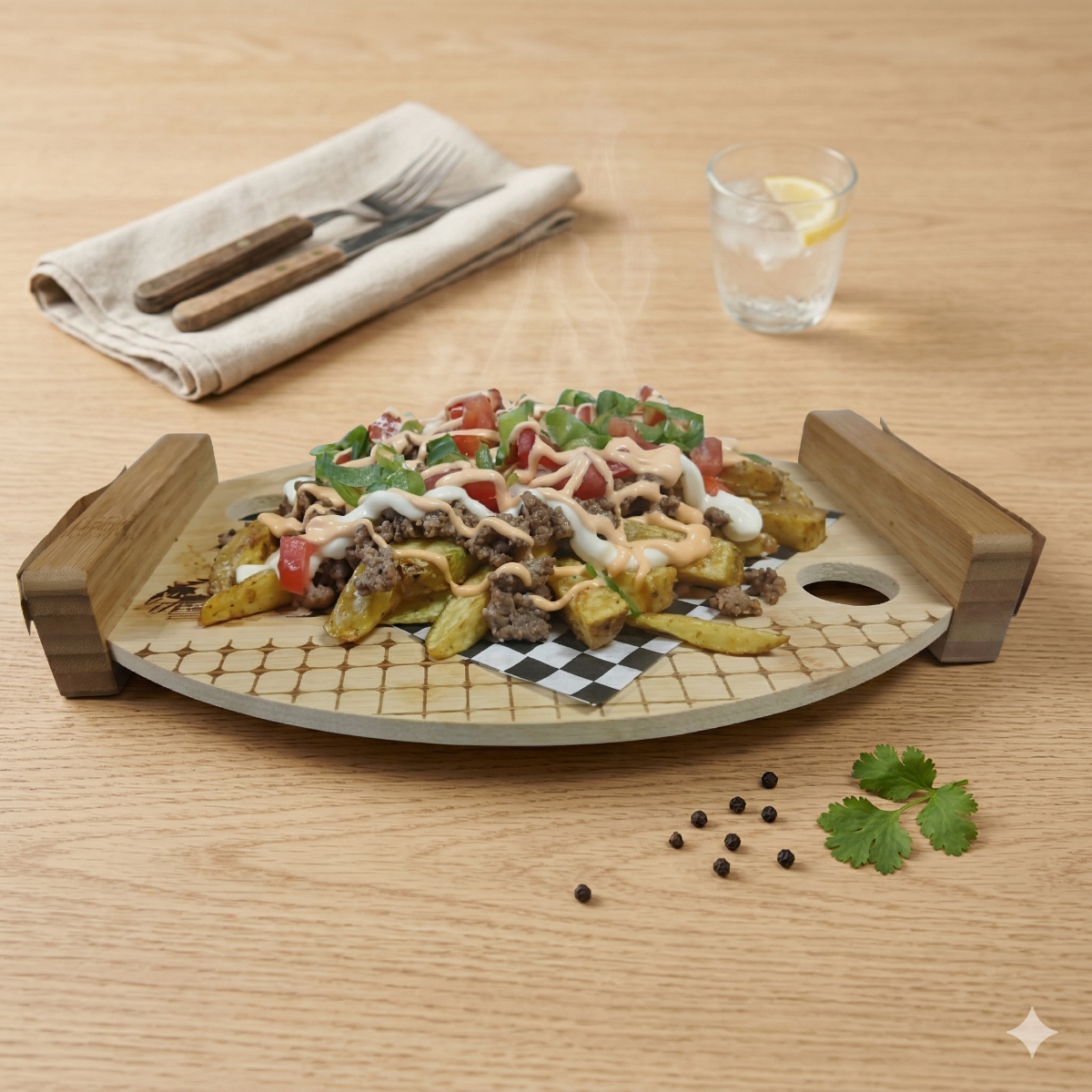 1 papa suprema (Papa fritas naturales, carne molida, natilla, salsa futwings, tomate, cebollinos y cebollita crispy) 1 gaseosa o tropical 250ml
