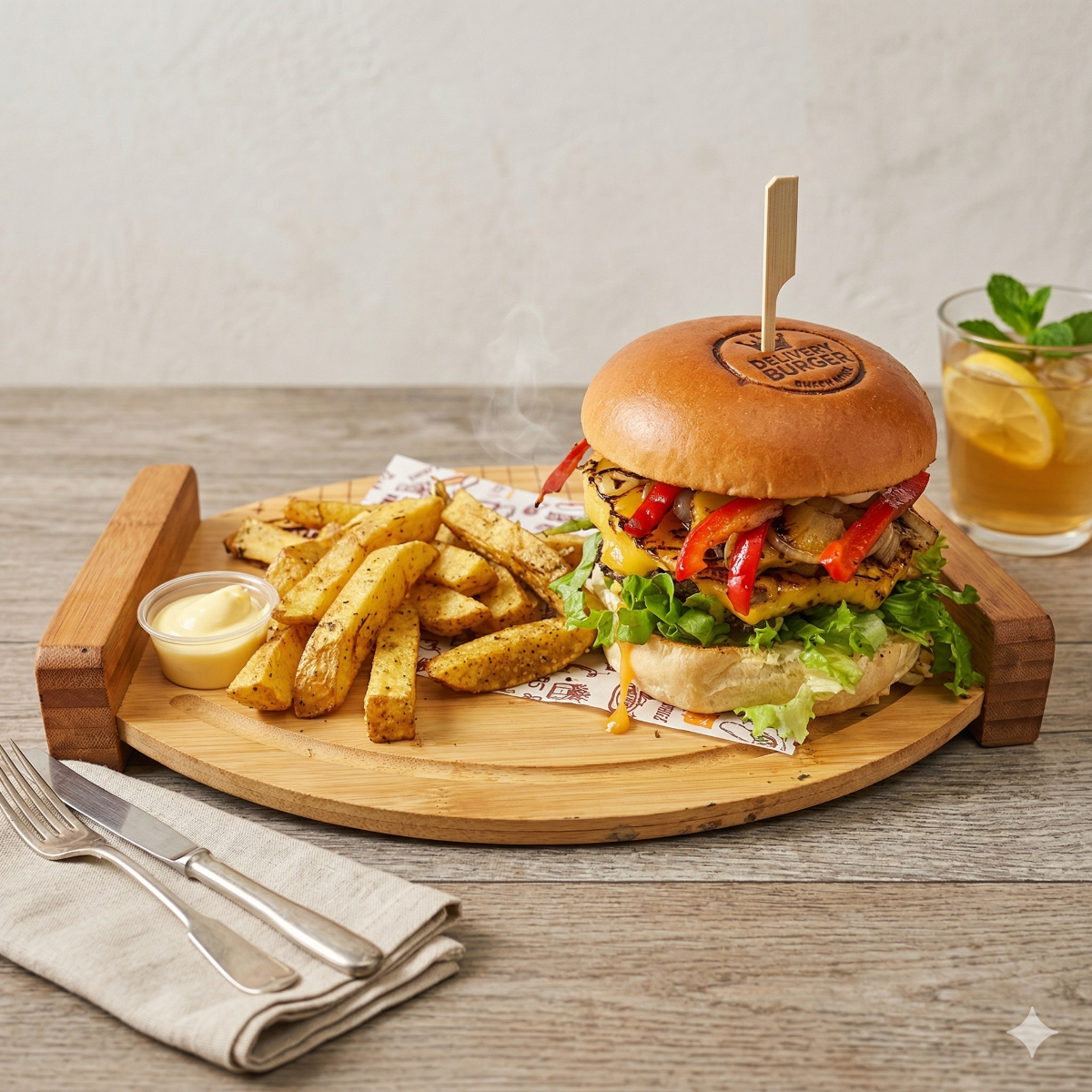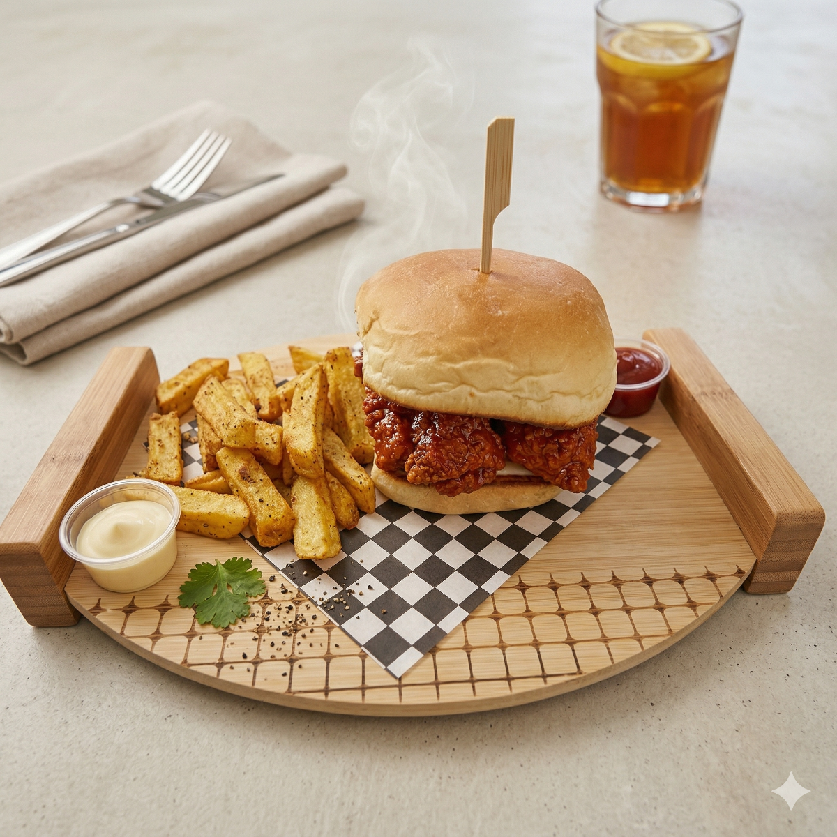 1 Buffalo chicken burger (Pan artesanal de la casa, queso, tomate, strips de pollo crispy, cebollita crispy, salsa búfalo y salsa ranch) 1 orden papas fritas naturales 1 refresco según disponibilidad de 250ml