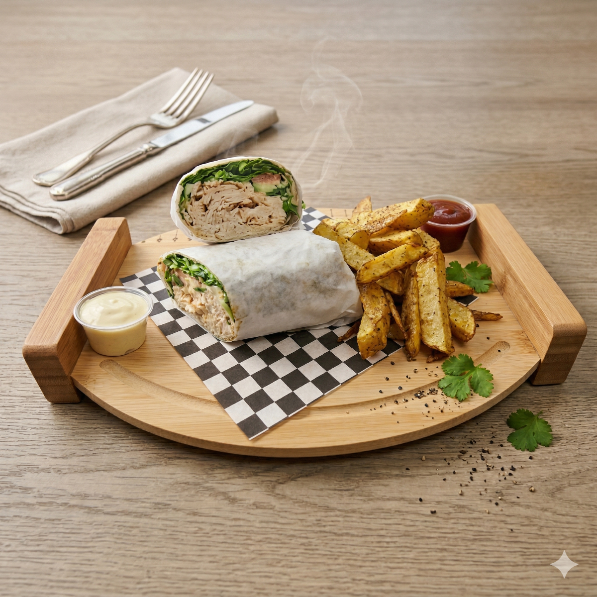 1 wrap pollo (Tortilla de harina 12", lechuga, tomate, pepinillos, mix de queso mozarella y cheddar, salsa futwings, salsa ranch y strips de pollo crispy) 1 orden papas fritas naturales 1 refresco según disponibilidad de 250ml