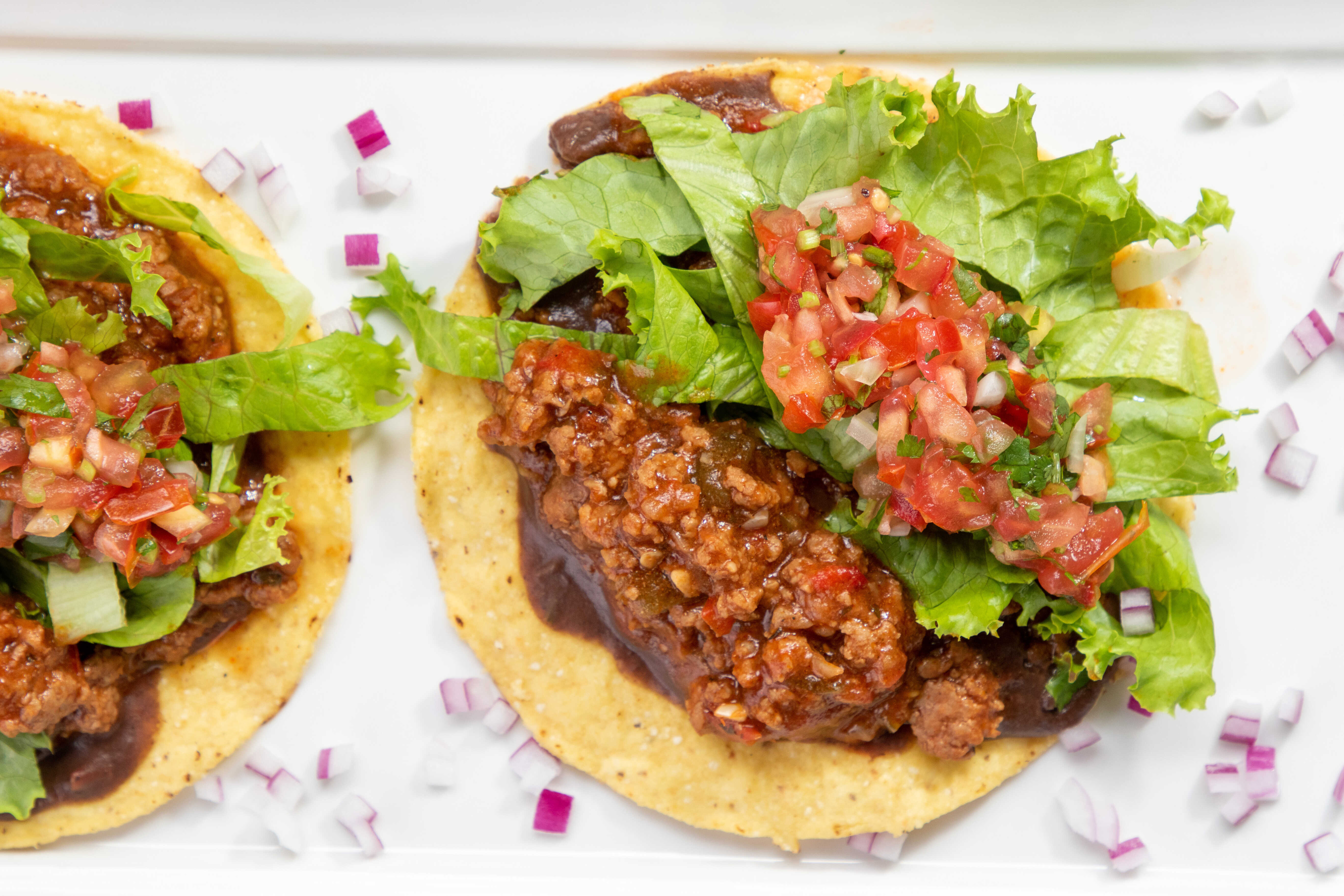 Dos tortillas de maíz fritas con base de frijol molido acompañado con la proteína de su preferencia, lechuga, pico de gallo, guacamole, natilla y aderezo de chipotle opcional.