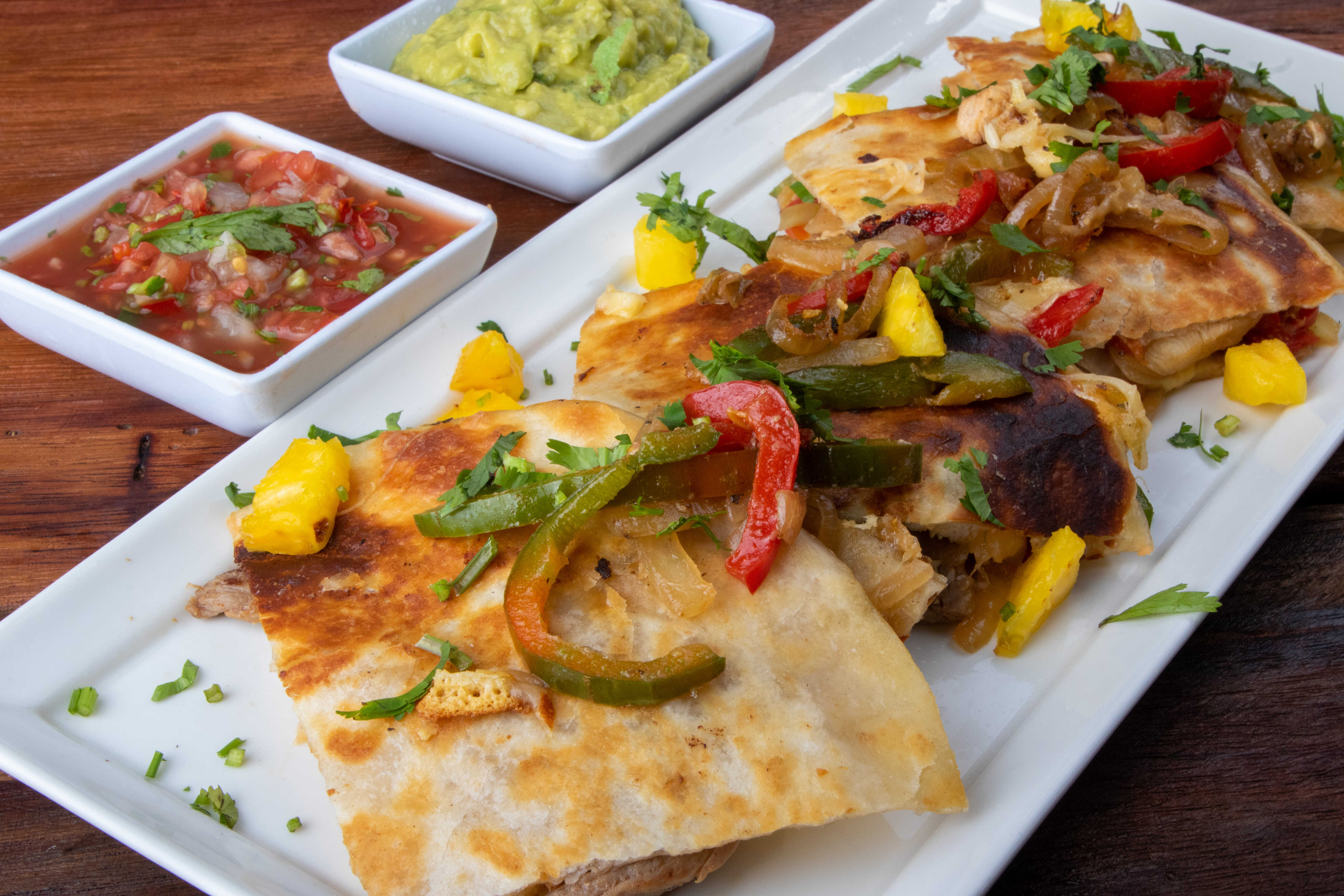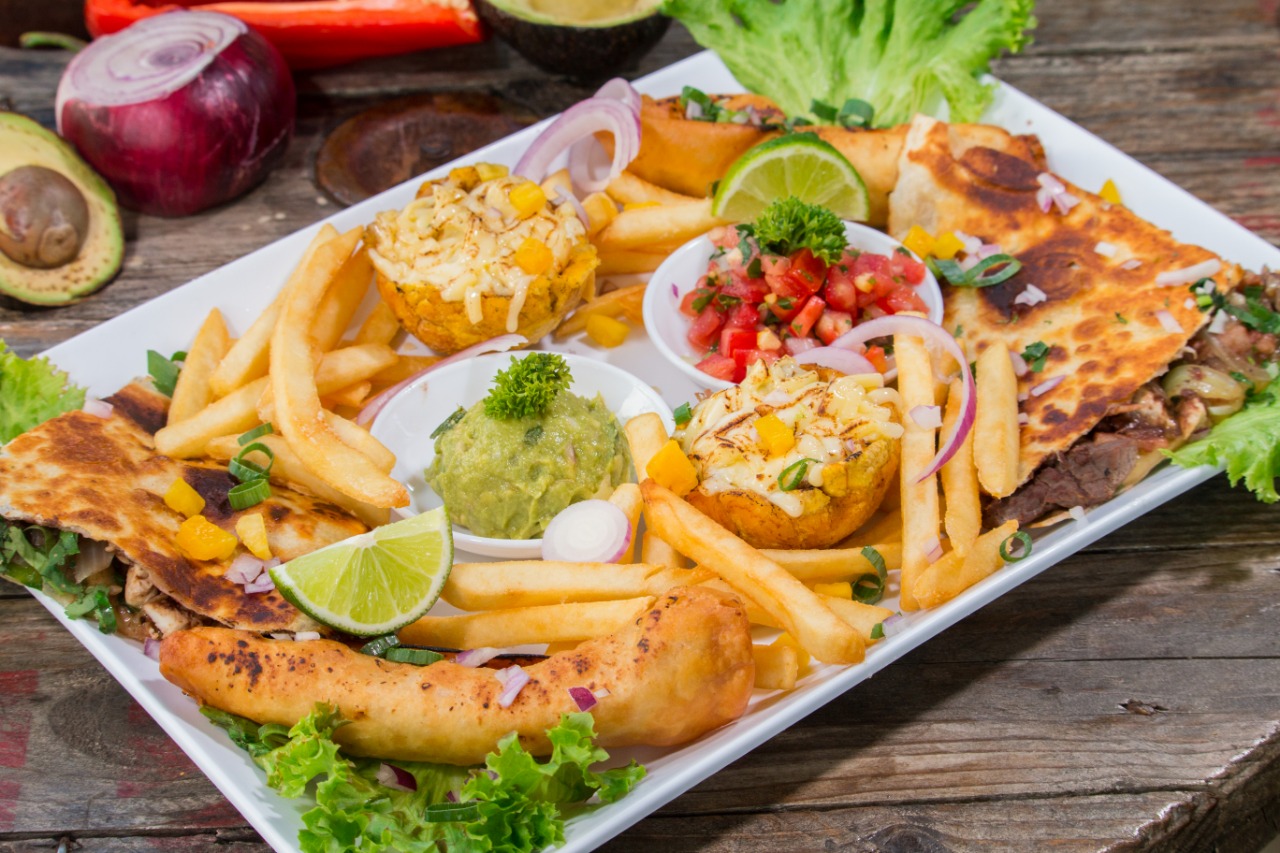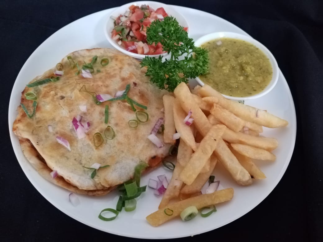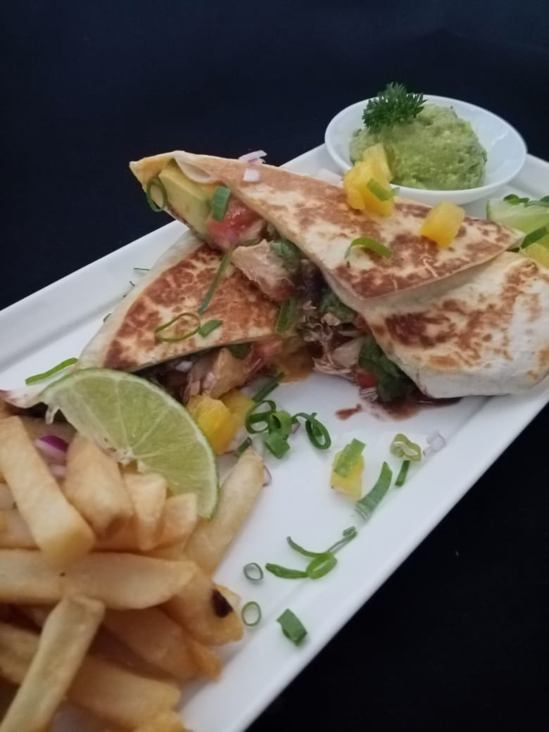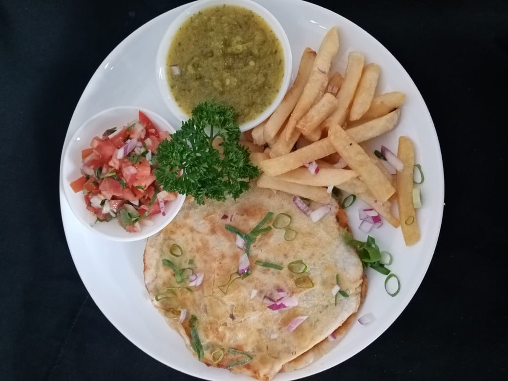 Tortilla de trigo, rellena de queso mozzarella y la proteína de su preferencia, con cebolla y chile dulce, acompañada de papas a la francesa, pico de gallo y guacamole.