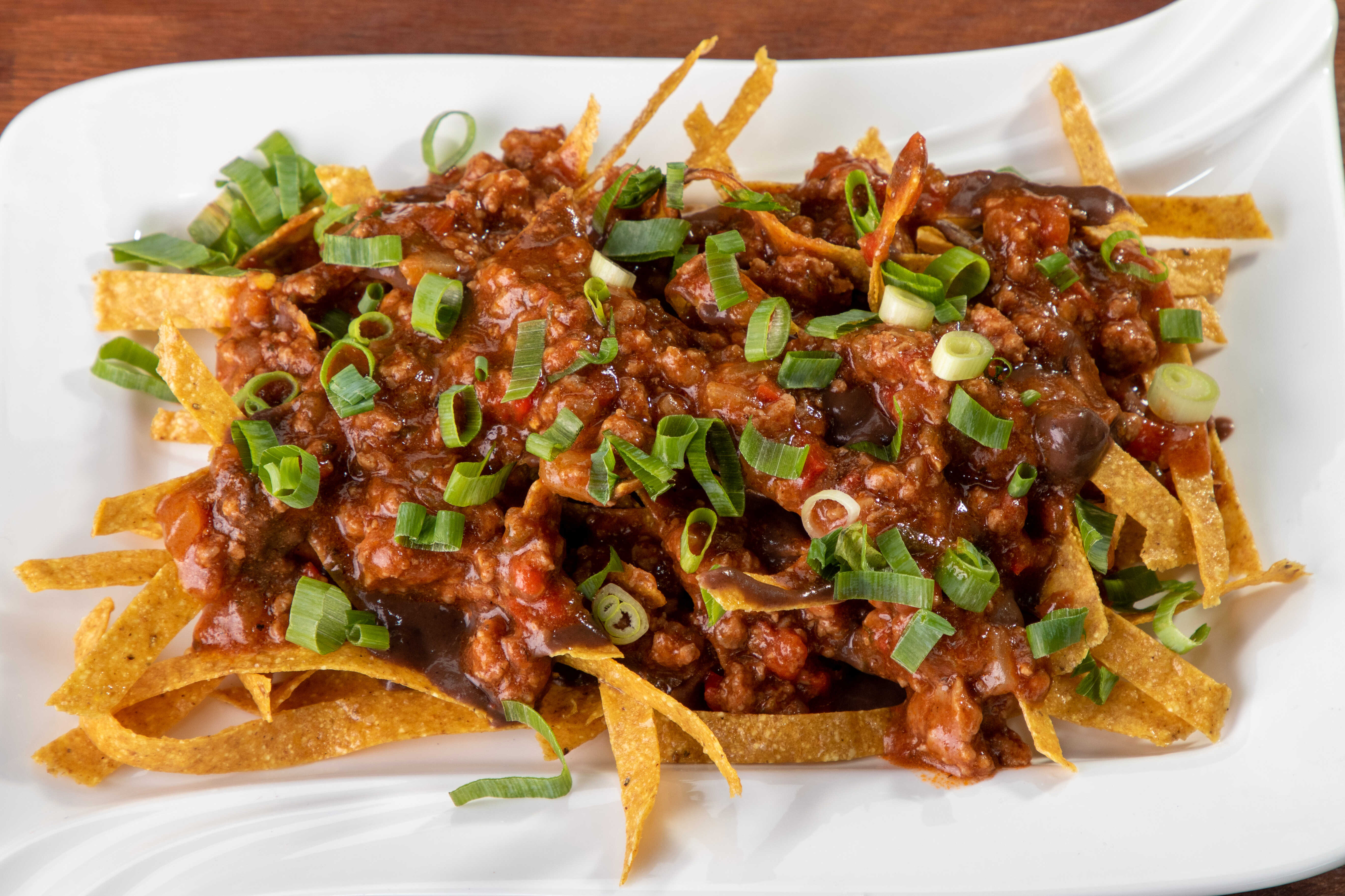 Tiras de tortillas de maíz frita, bañado en frijoles molidos, con su acompañamiento de salsa de carne, natilla y cebollino.