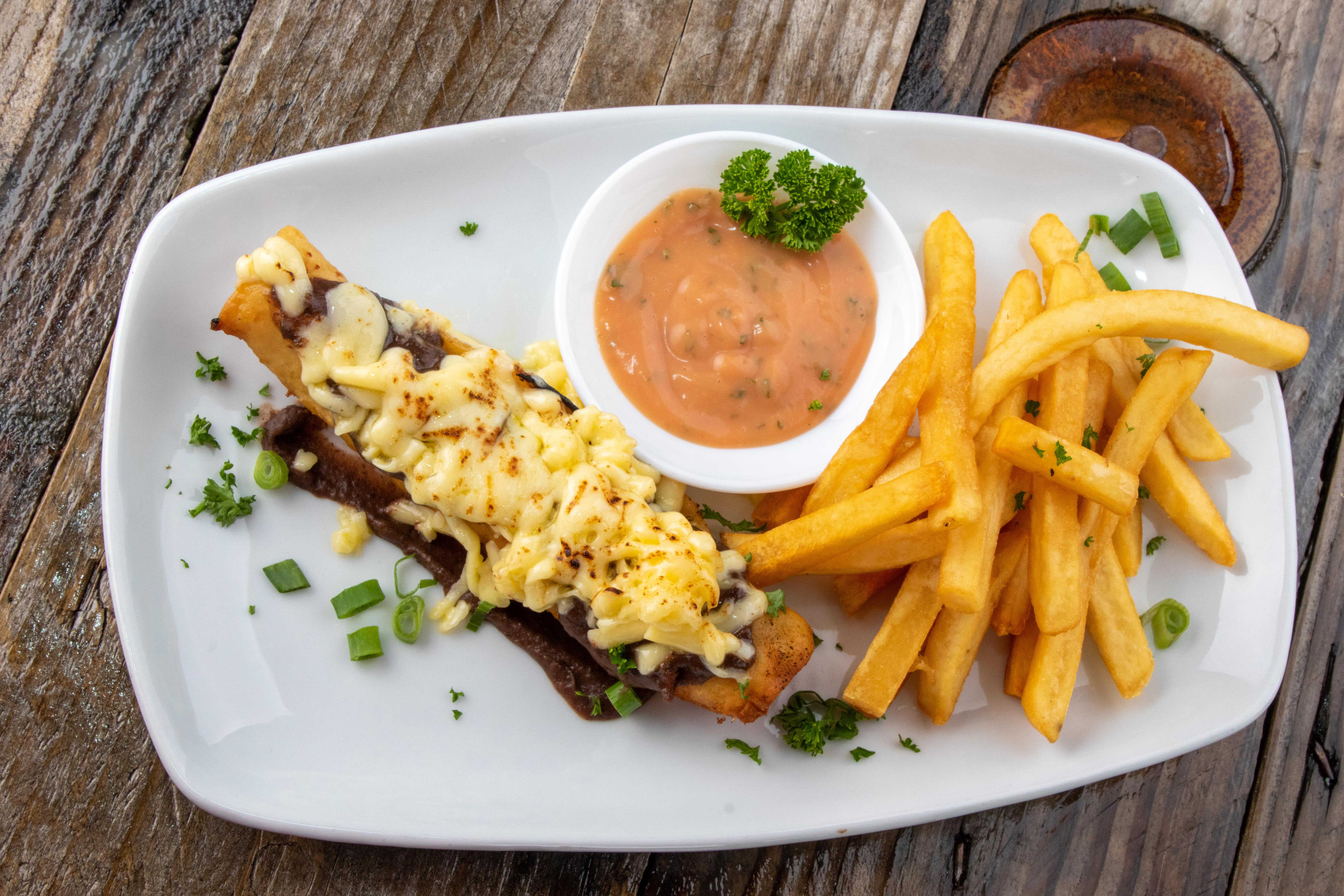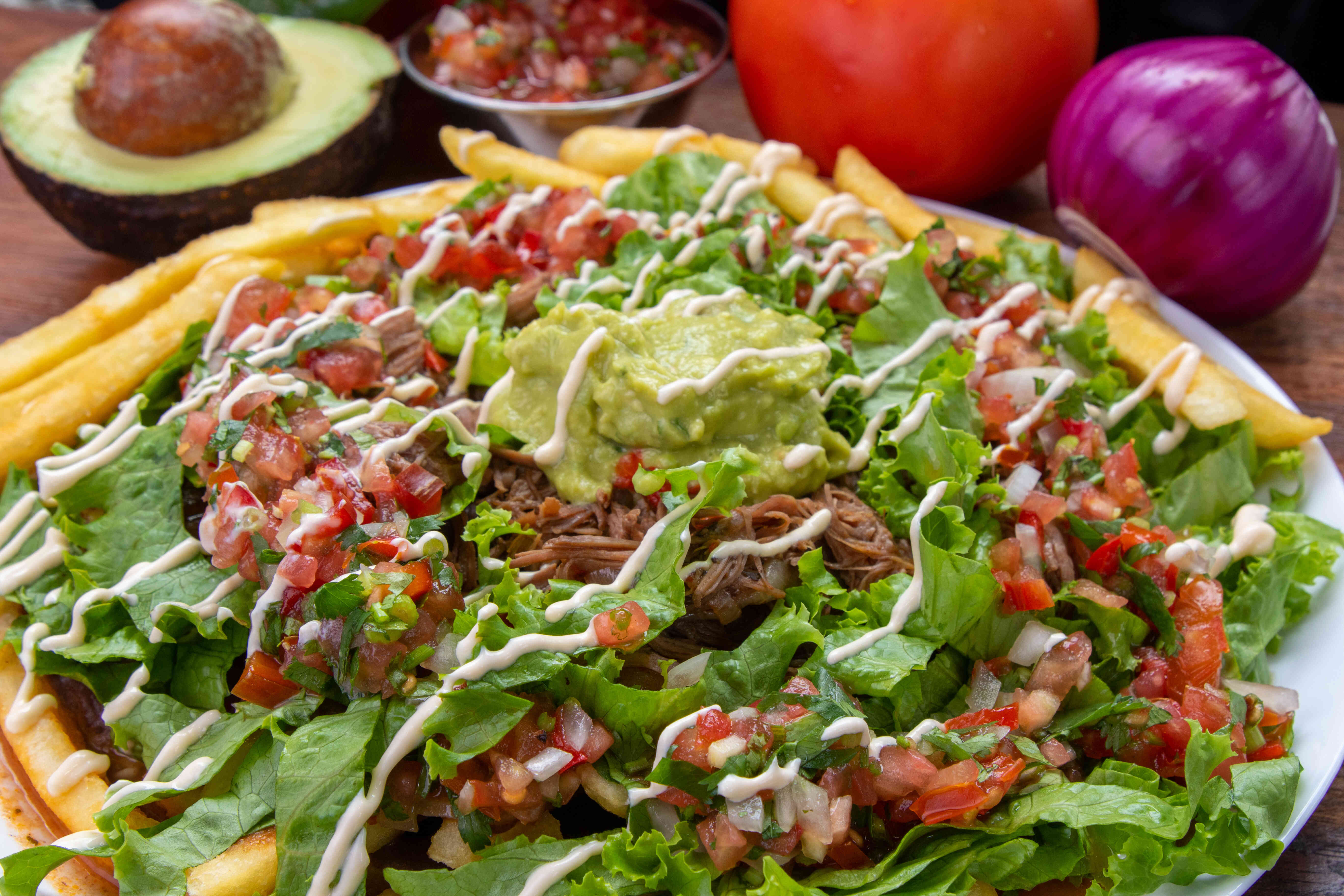 Papas fritas con base de frijoles molidos, con la proteína de su preferencia, acompañado de lechuga, pico de gallo, guacamole, natilla y aderezo chipotle opcional.