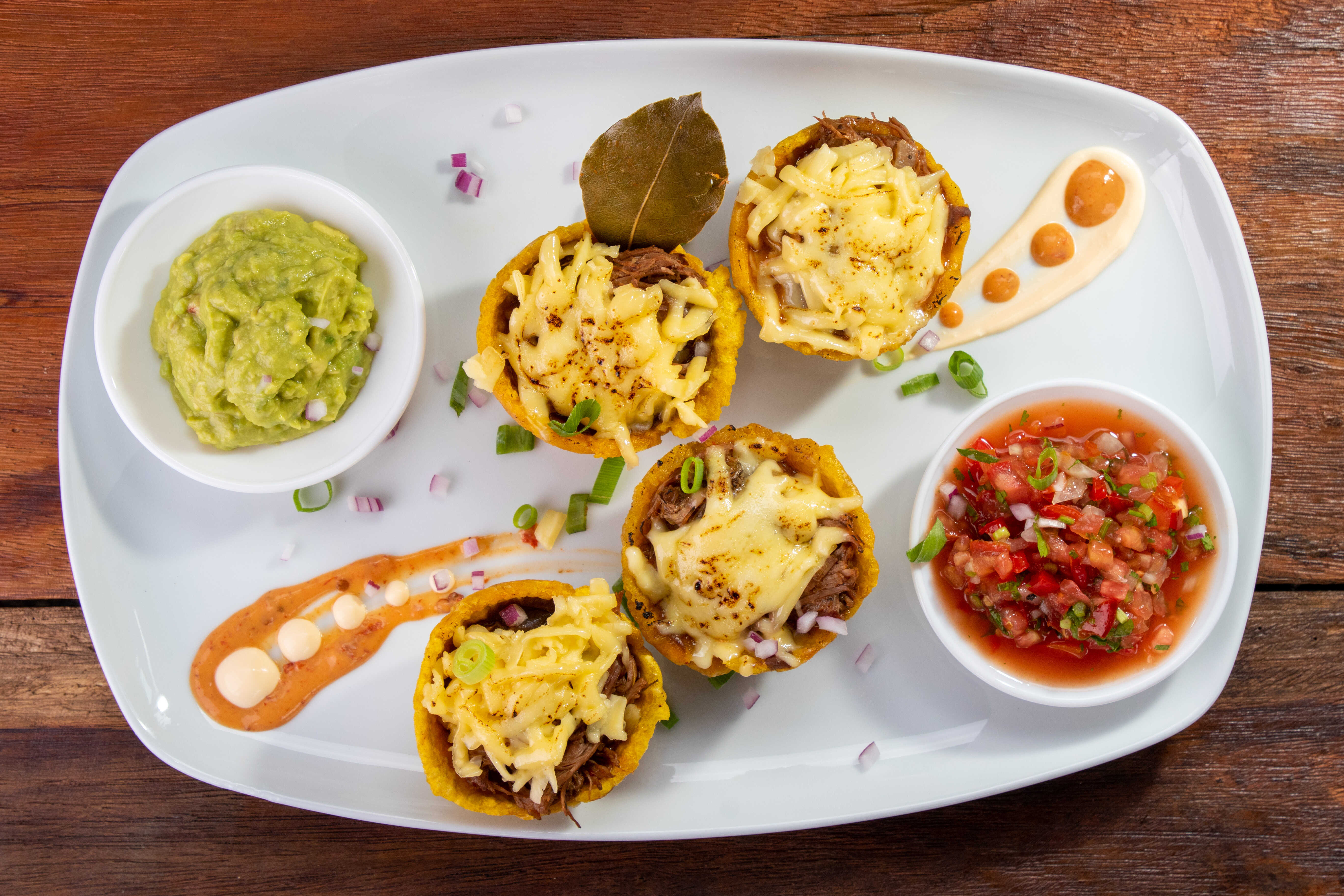 Dos o cuatro canastillas de patacón tostadas, rellenas con la carne de su preferencia, frijoles molidos, gratinado de queso mozzarella, acompañado con pico de gallo, guacamole y salsa chipotle opcional.