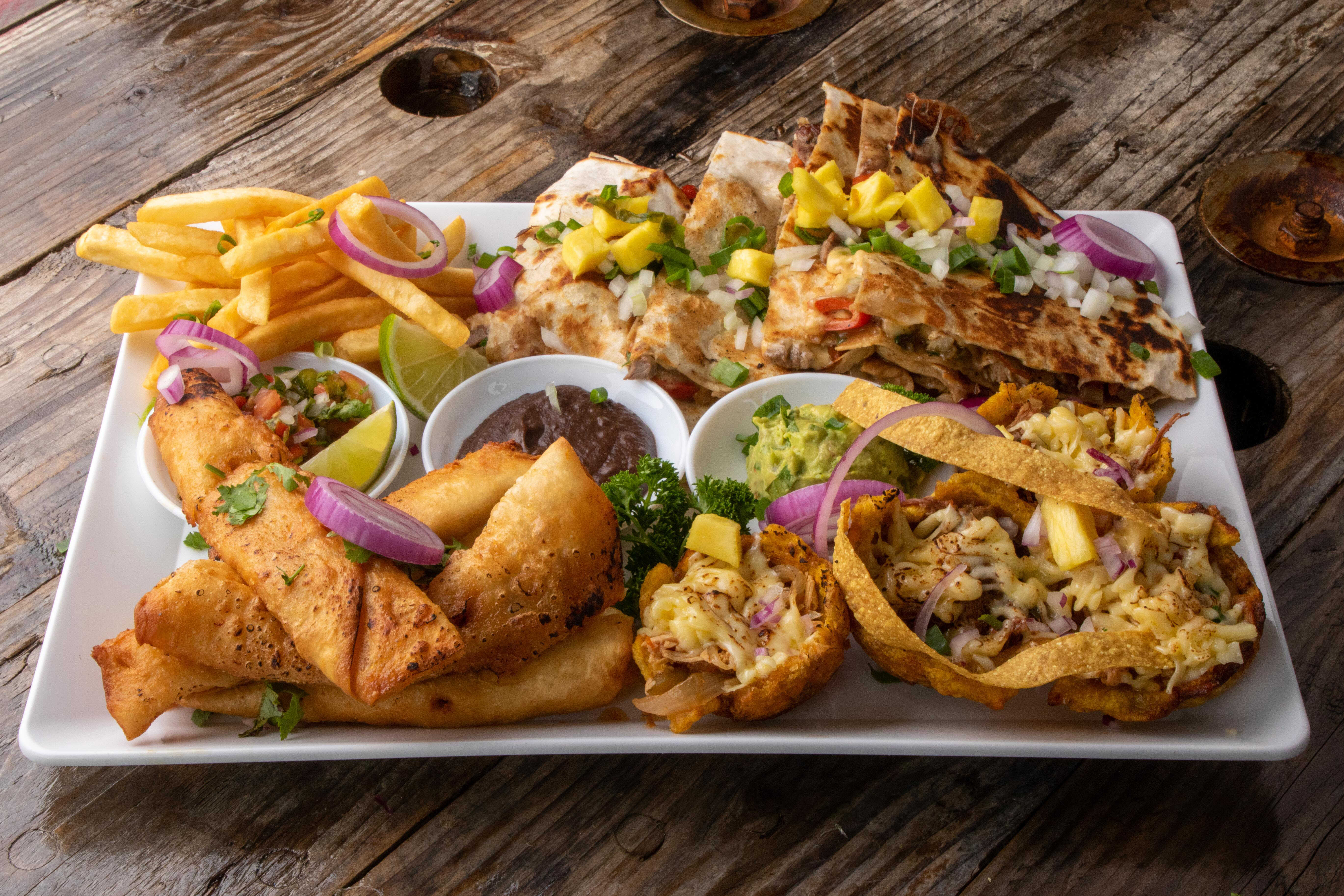 Deliciosa combinación de nuestros selectos platillos, compuestos por 1/2 discada, 2 flautas, 2 canastas de patacón, acompañado de papas fritas, pico de gallo, guacamole y aderezo chipotle opcional.