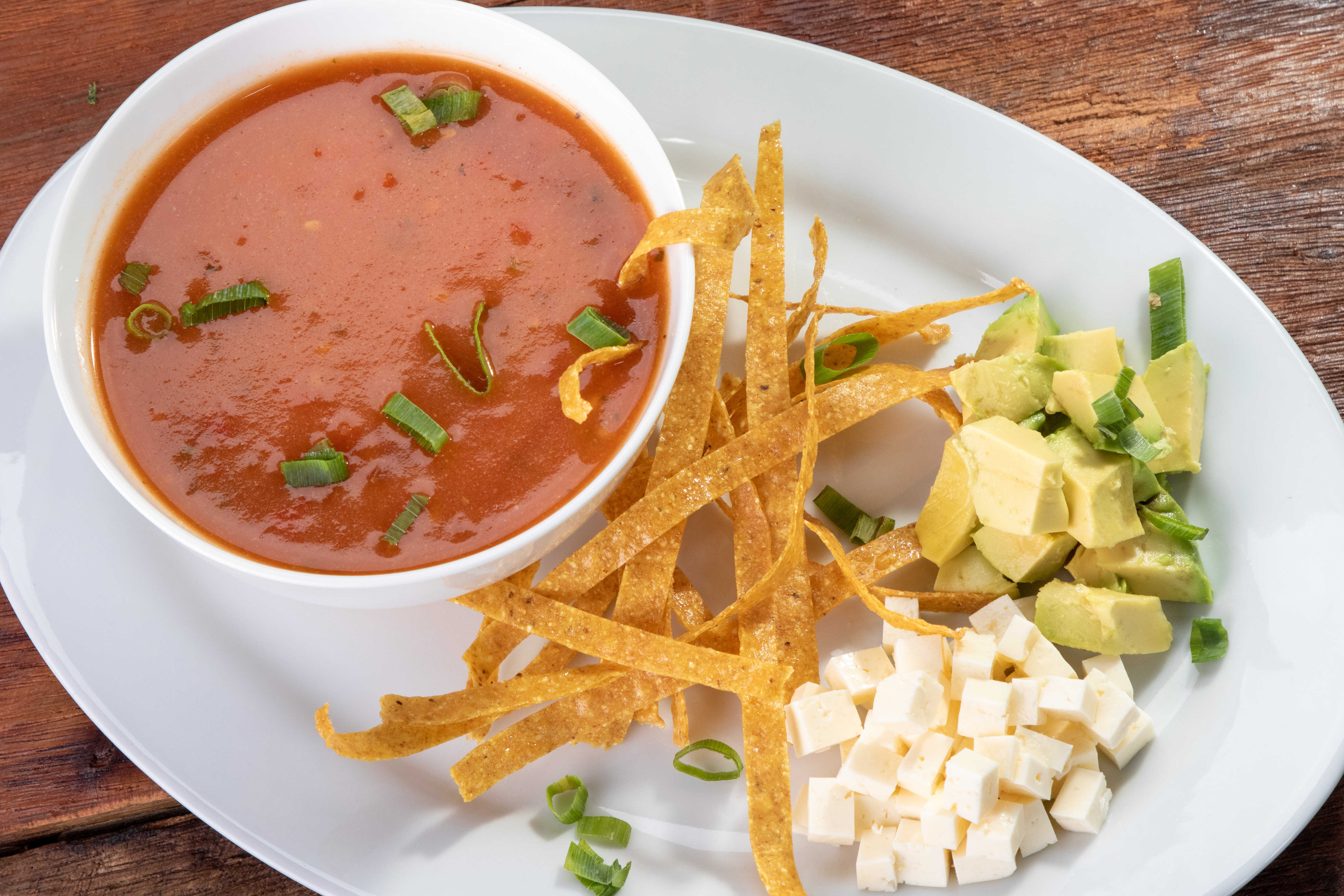 Sopa de tortilla con tomate acompañada de pollo, dedos de aguacate y queso, tiritas de tortilla frita y natilla.