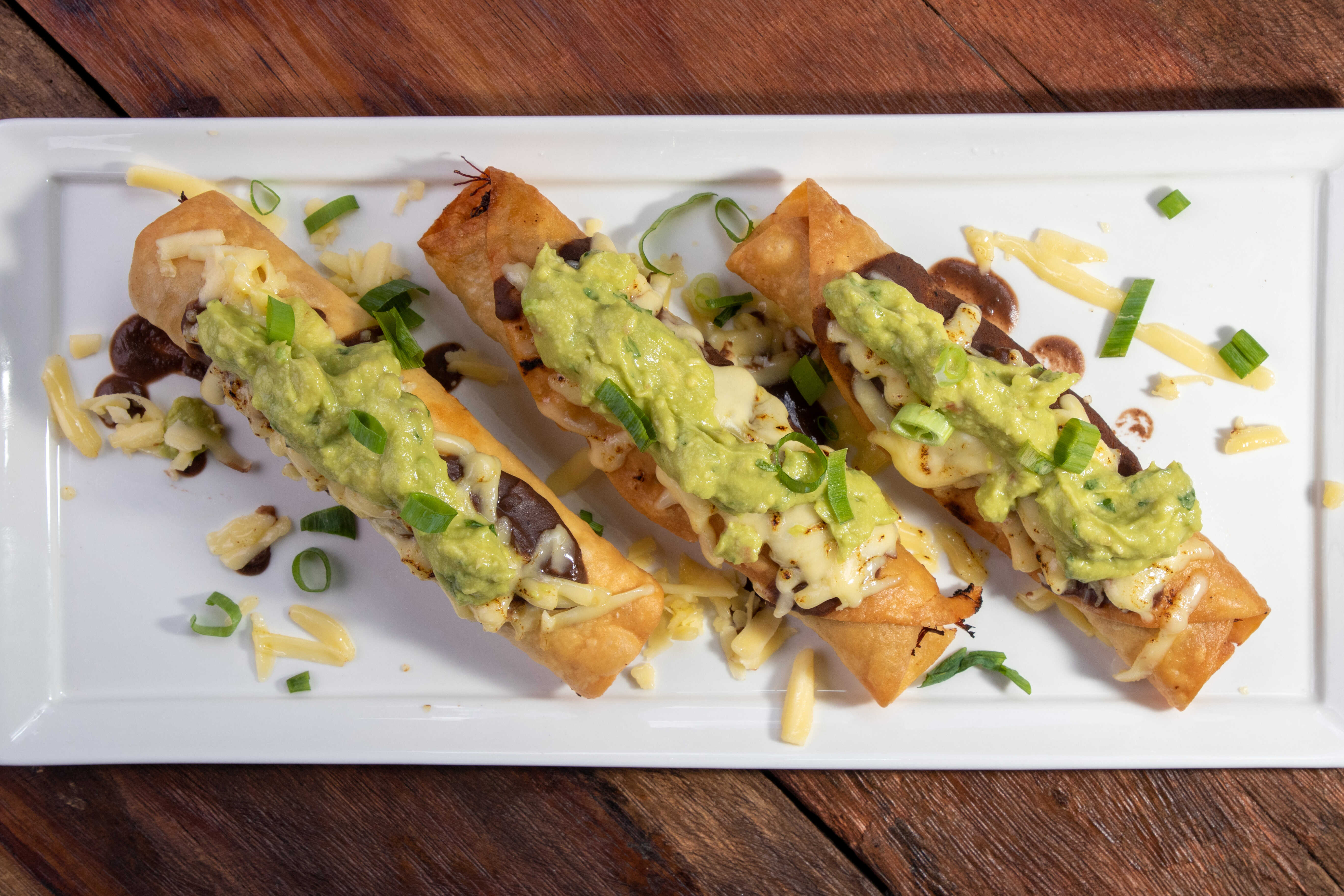 3 Tacos fritos de tortilla de harina, relleno de carne desmechada, napados con frijoles molidos, guacamole y gratinado de queso mozzarella.