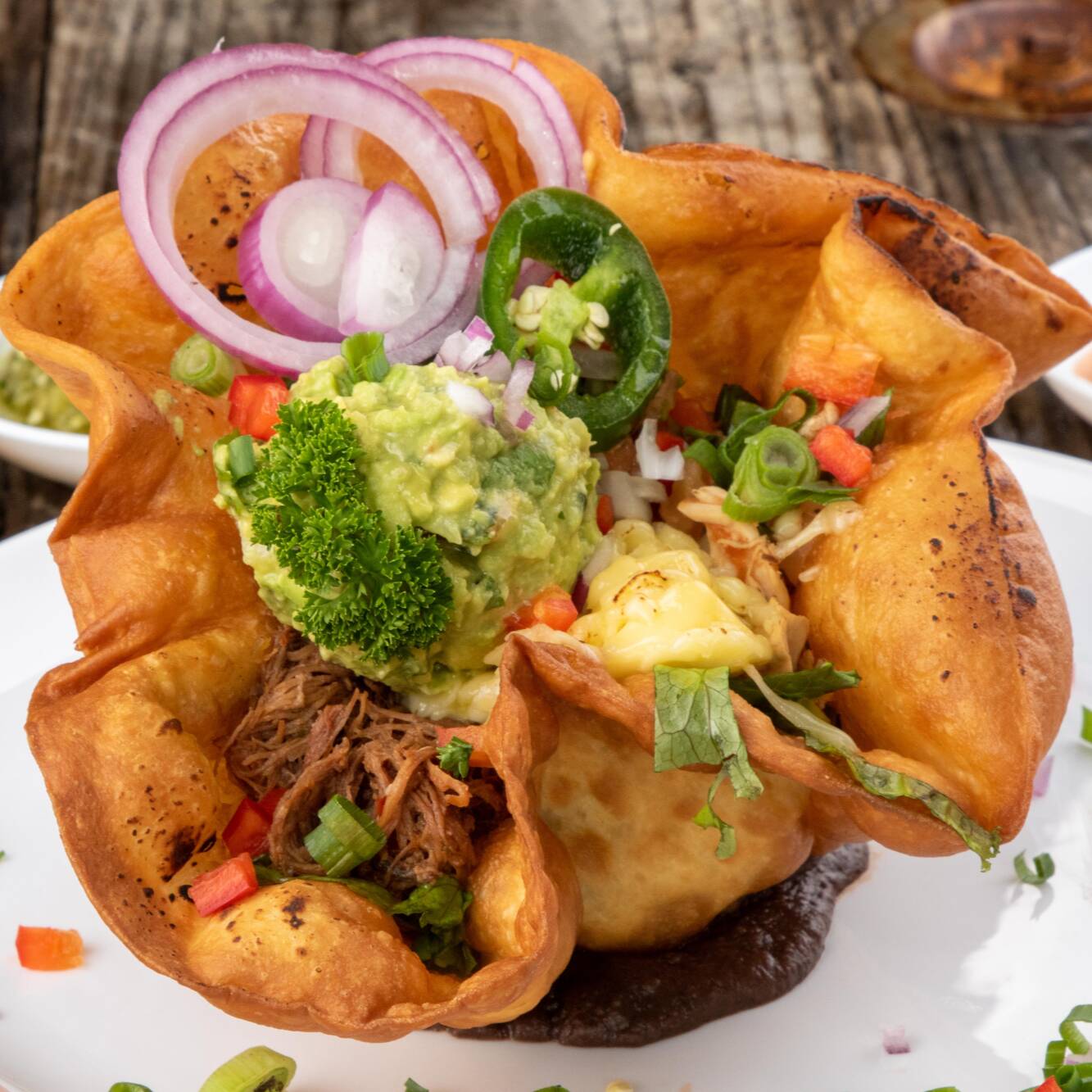 Crujiente tortilla de harina en forma de canasta rellena de frijoles molidos, lechuga fresca, la proteína de su preferencia y gratinado con queso mozzarella, acompañado de pico de gallo y guacamole.