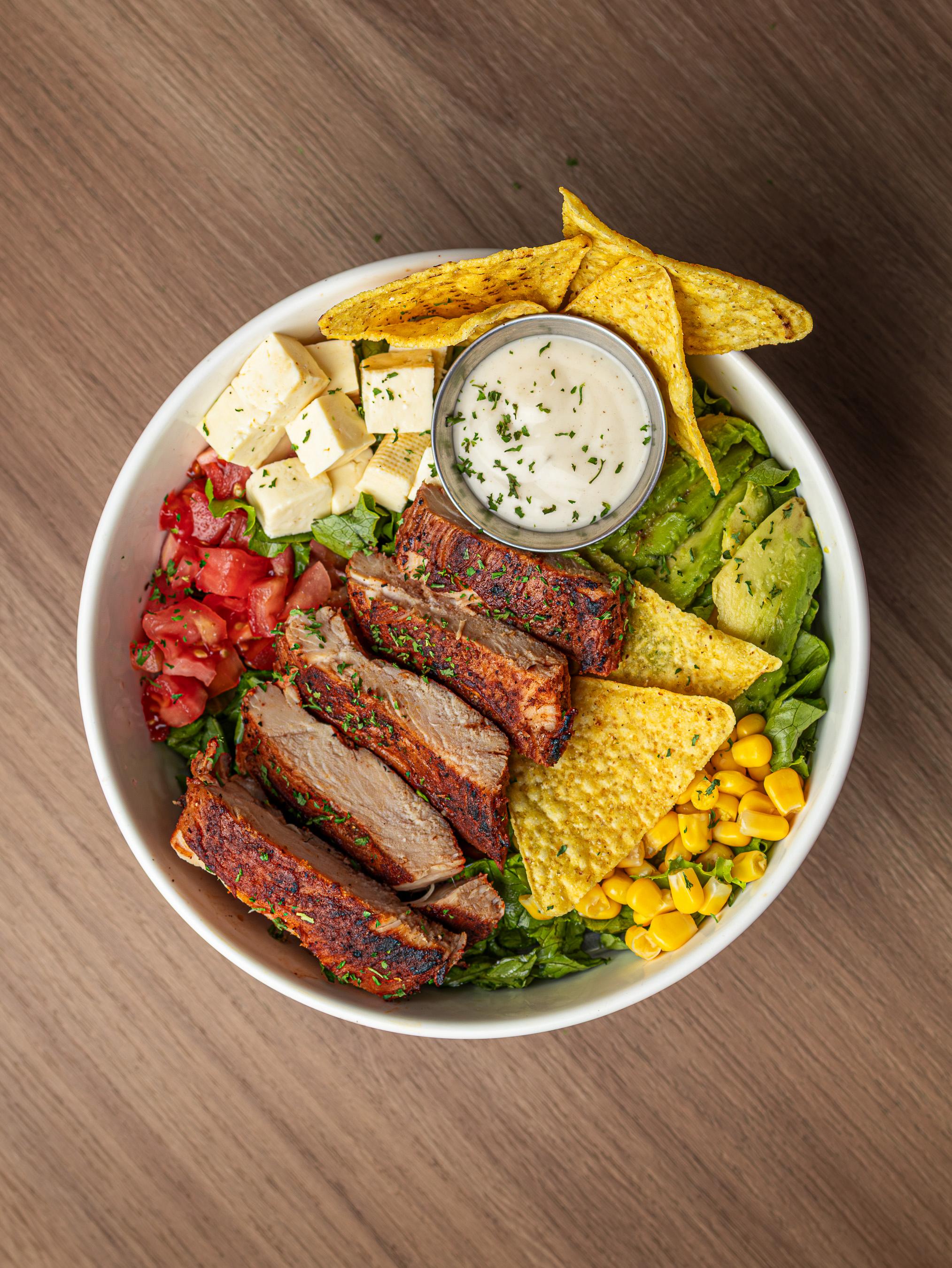 cama de lechuga, cubitos de queso fresco, tomate picado, aguacate, maíz dulce, acompañada de tortillitas y salsa ranch. Elige tu proteína favorita.