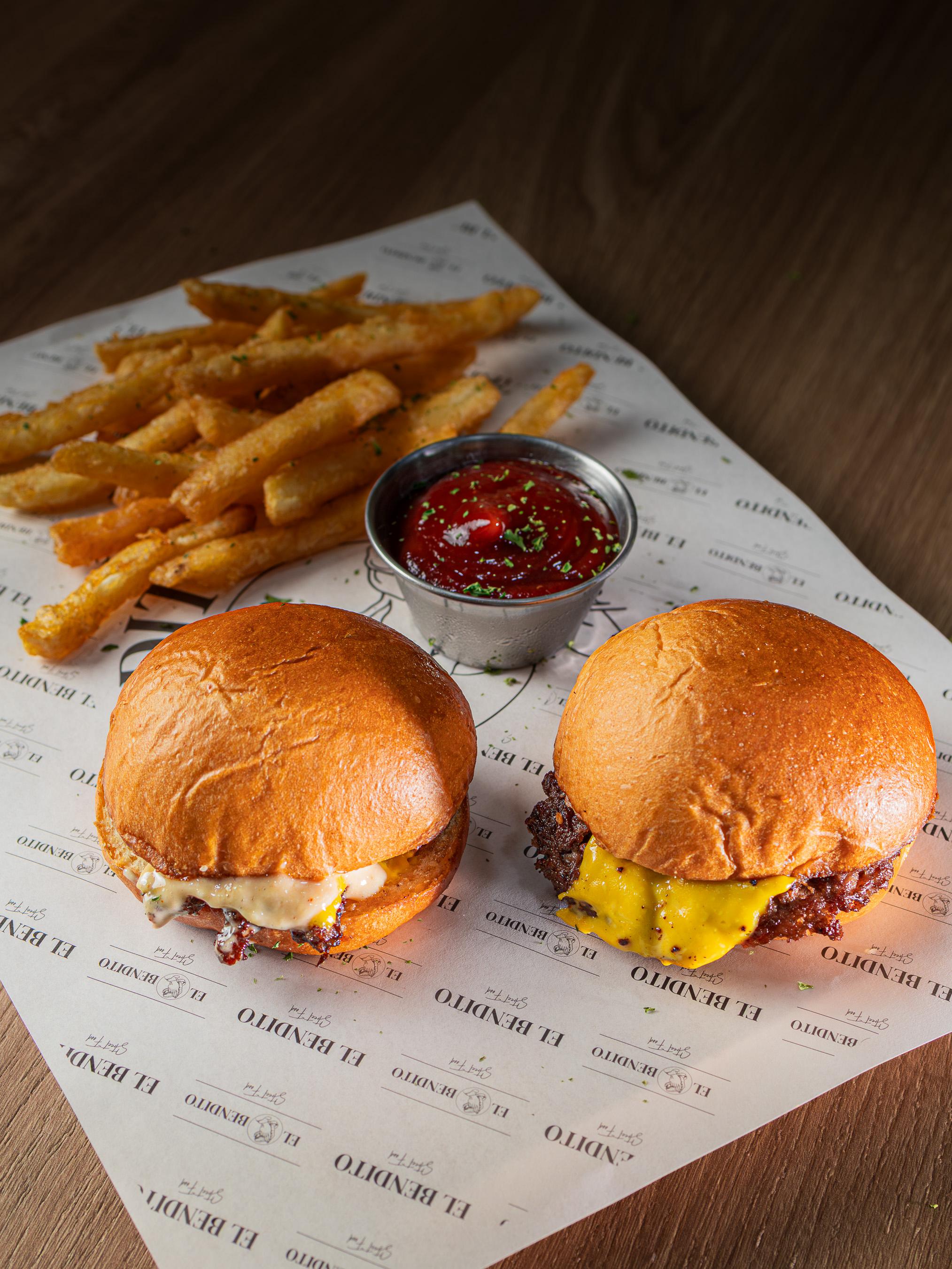 dos mini hamburguesas con torta smash 100% angus, queso americano, salsa angelical acompañada de papas fritas y ketchup