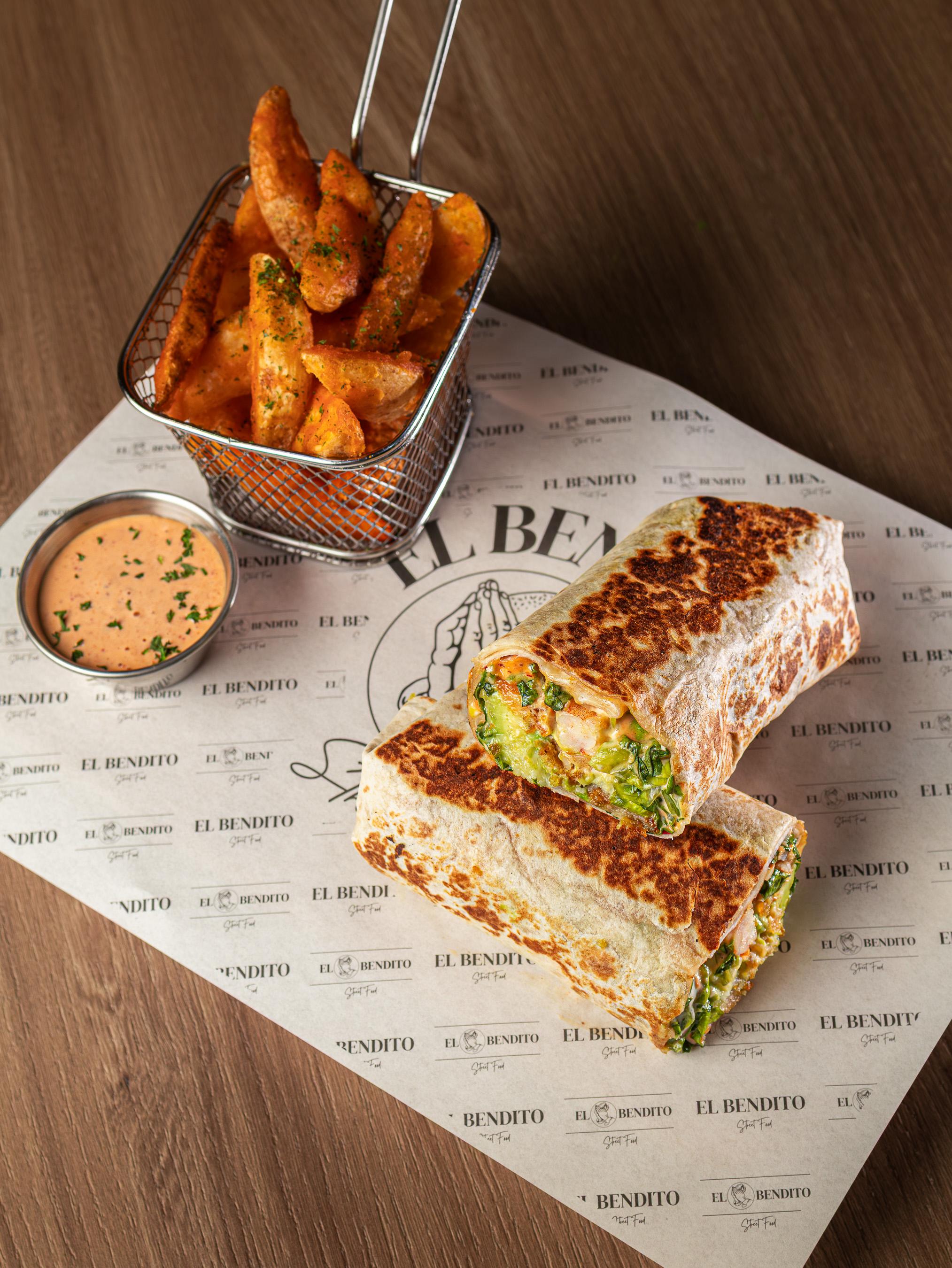 tortilla de harina acompañada de camarones empanizados, queso mozarella derretido, aguacate, lechuga, papa rayada, natilla y salsa chipotle.