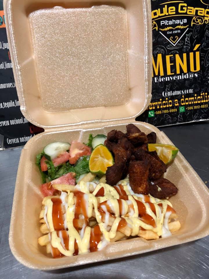 Acompañado con papas fritas, lechuga, tomate, frijoles molidos y queso.