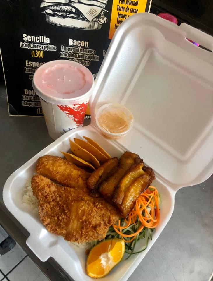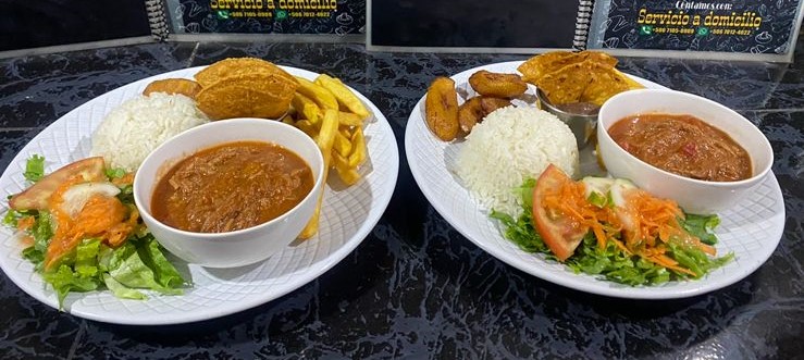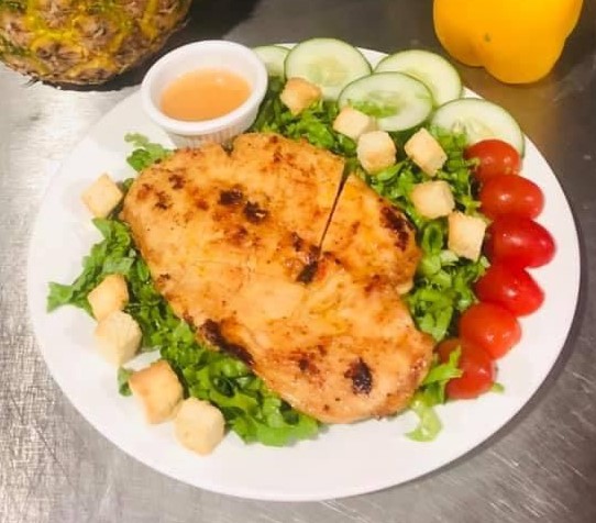 Acompañado con pollo caribeño, ensalada verde (lechuga y tomate) y patacones.