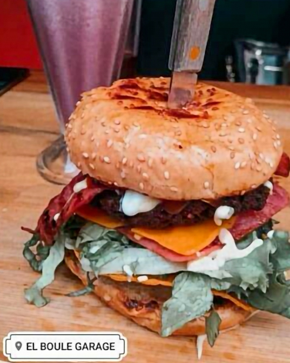 Pan artesanal, jamón, queso, tocino, lechuga, tomate, pepinillos y tortilla crujiente.