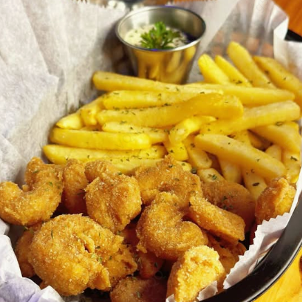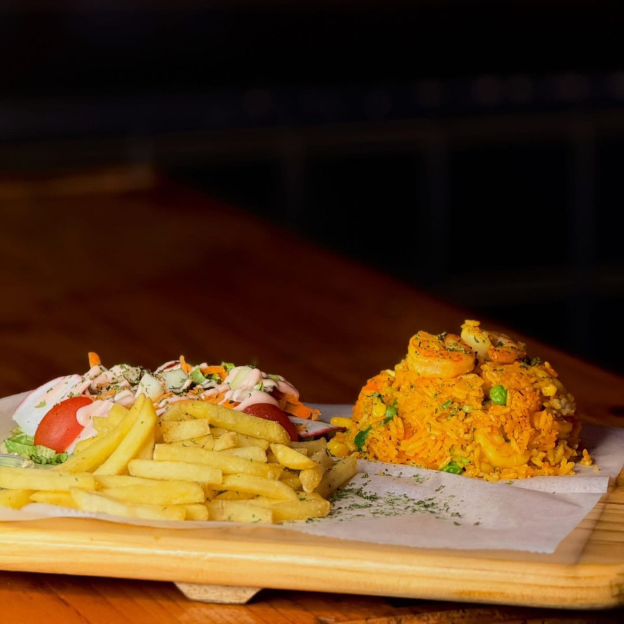 Porción grande acompañado de ensalada verde, aderezo de la casa, papas a la francesa y salsa de la casa. Contiene mariscos 🦐