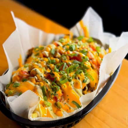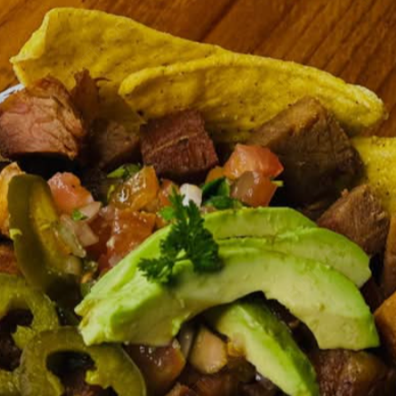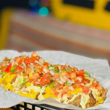 Papas fritas con carne mechada, pico de gallo, queso fundido mozzarella, salsa de queso y salsa de la casa.
