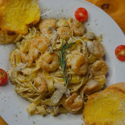 Pasta tallarín, pollo o camarón y salsa blanca.