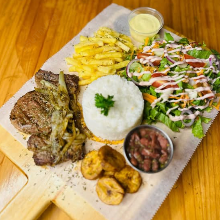 Acompañado de ensalada verde, aderezo de fresa, papas a la francesa y salsa de la casa.