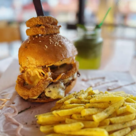 Pan artesanal, carne de birria de res, queso mozzarella, aros de cebolla y salsa chipotle. Acompañada de papas fritas o en gajo.