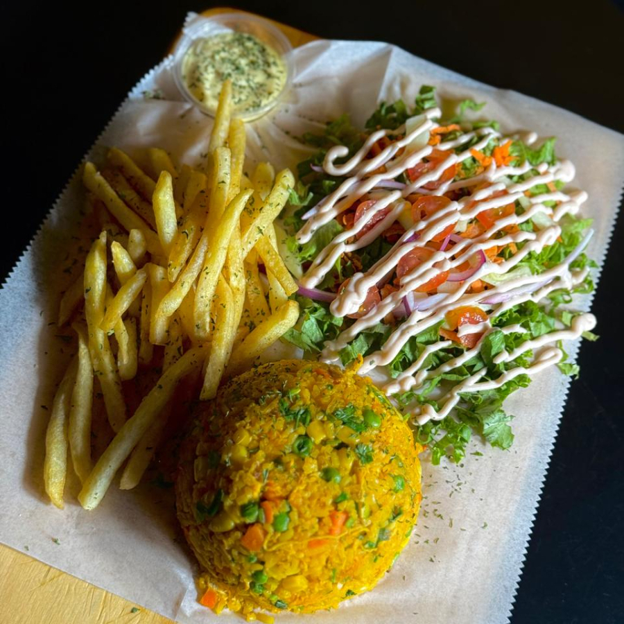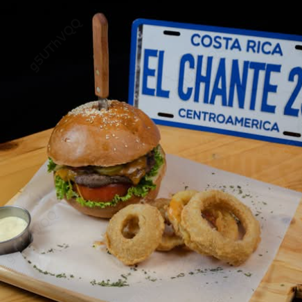 Pan artesanal, torta de 8 oz, cebolla morada, pepinillos, lechuga, tomate, queso cheddar, salsa de tomate y mostaza. Acompañada de papas fritas y salsa de la casa.