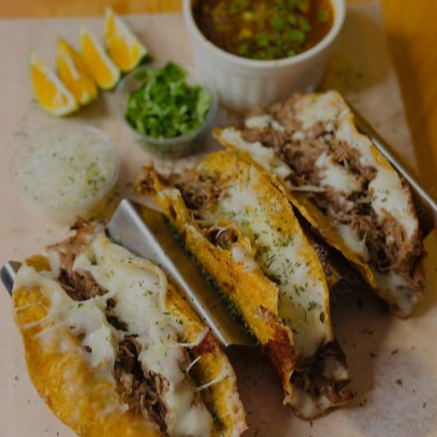 Jugosa carne de res cocida a fuego lento, servida sobre una tortilla de maíz con queso mozzarella, salsa roja mexicana, acompañado con consomé de su propia cocción. Picante 🌶️