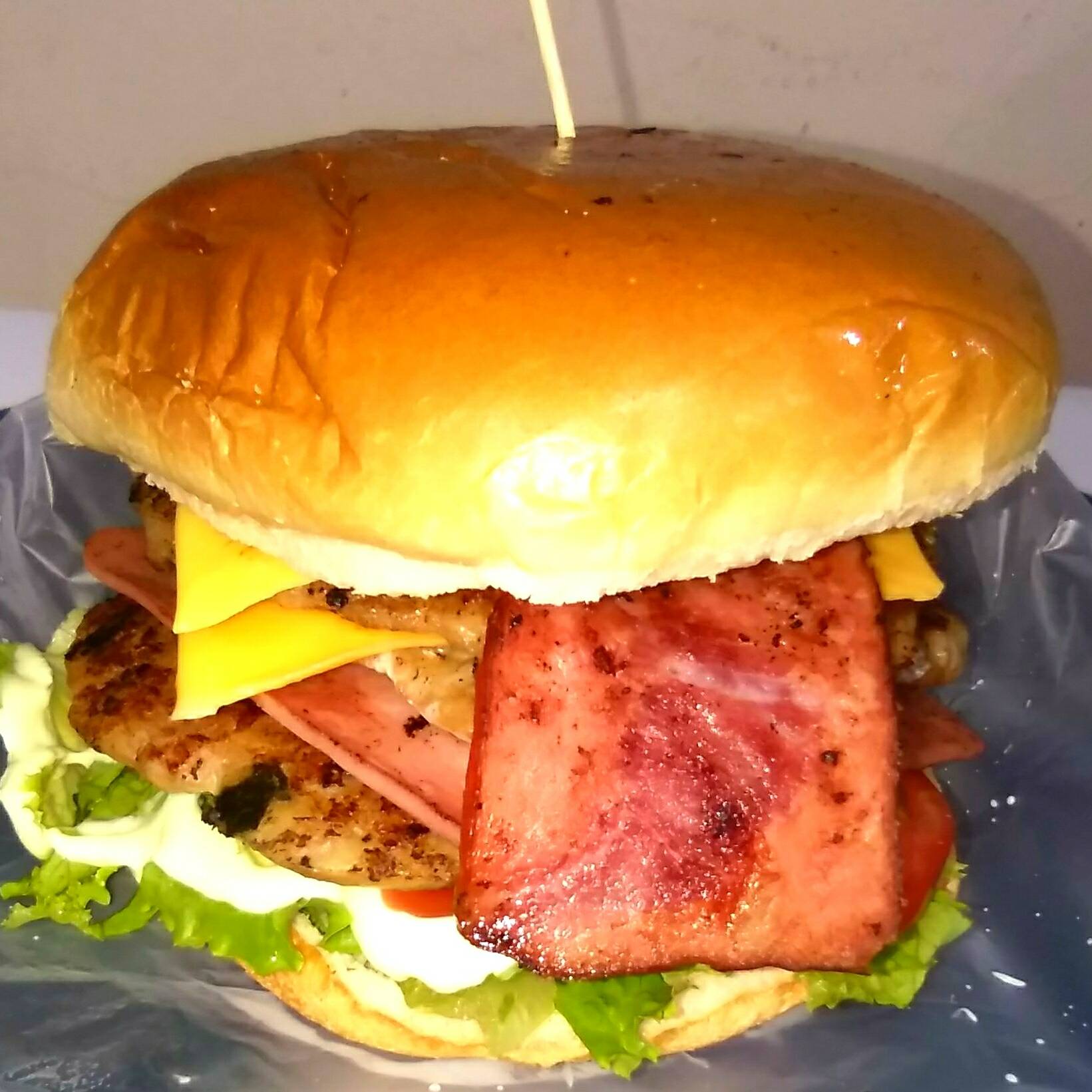 Pan de hamburguesa, 1 torta de carne de res, jamón, queso, lechuga, salsa de tomate y mayonesa.