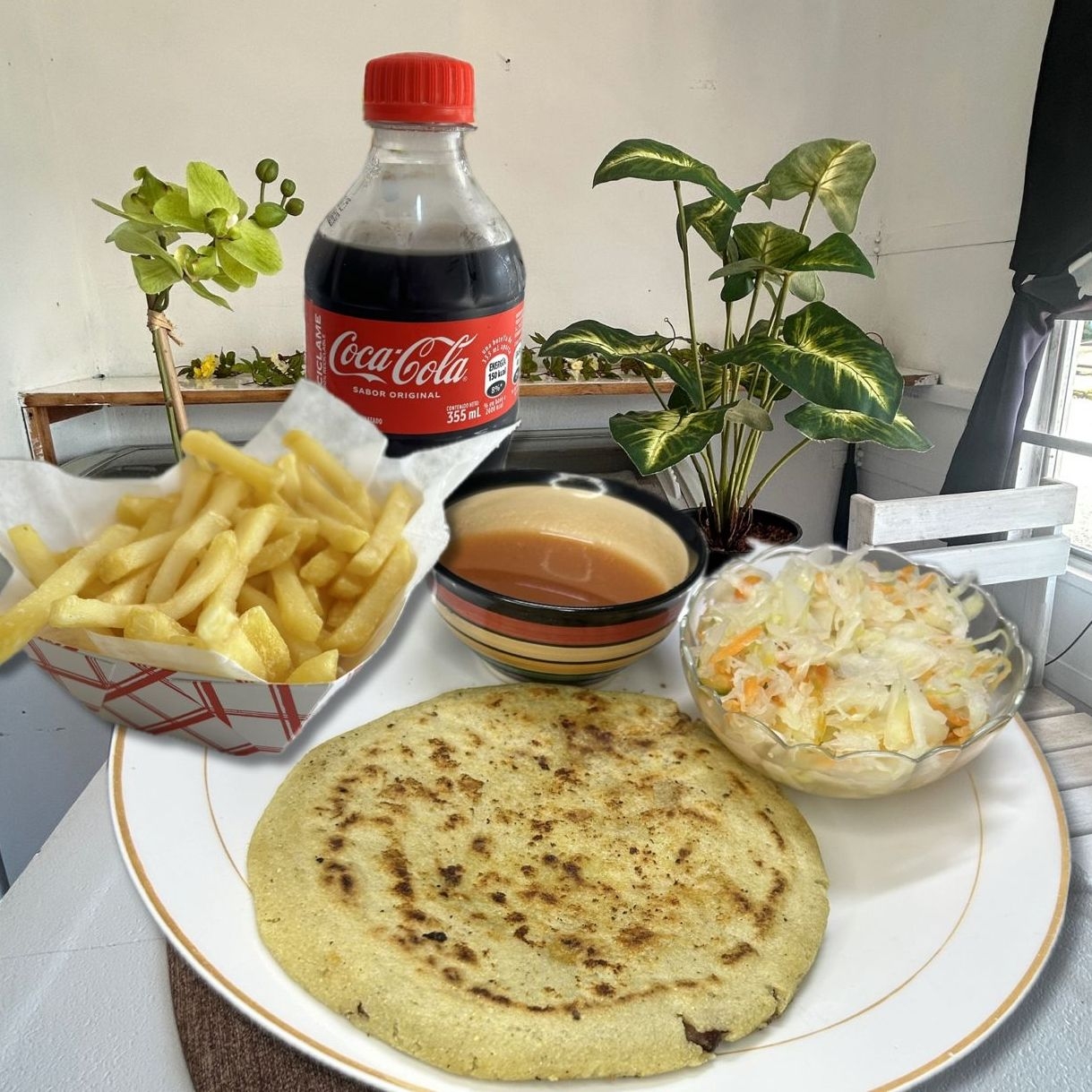 Una Pupusa Salvadoreña, 200g de papas fritas más una Coca Cola 355 ml.