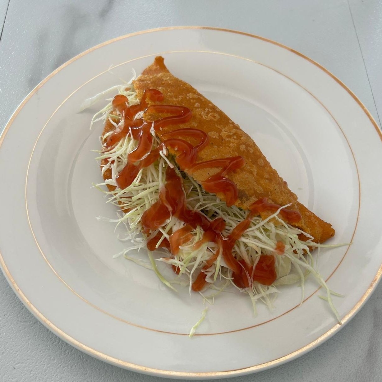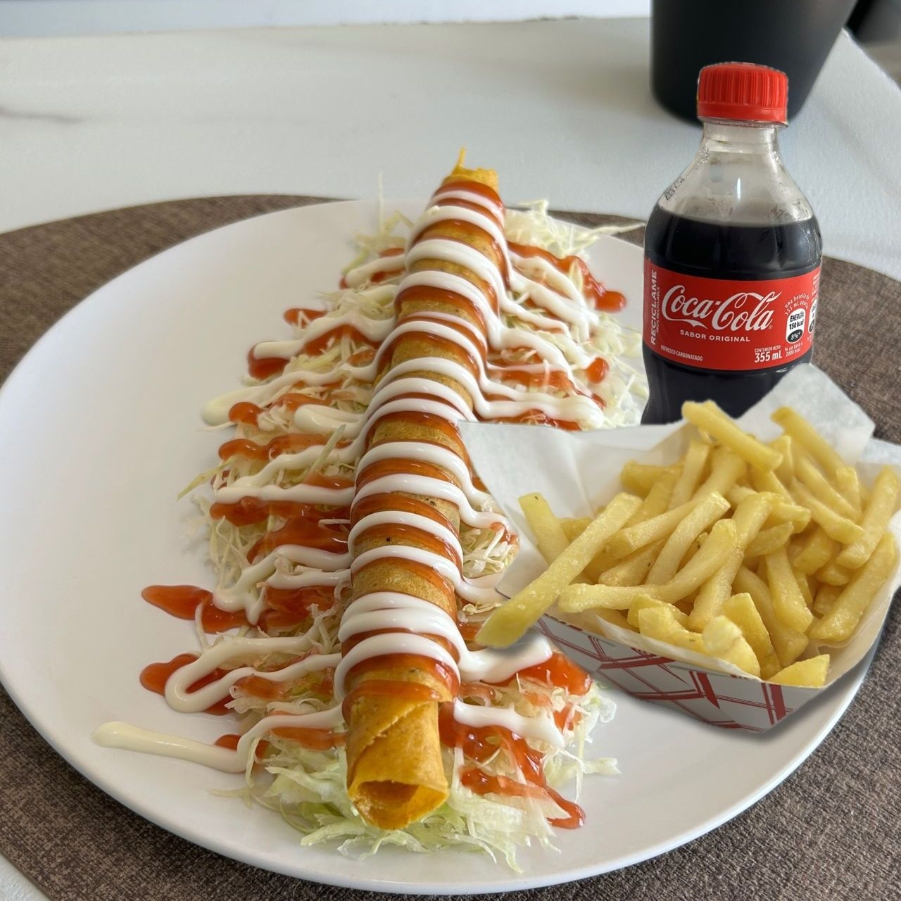 Taco de 30 cm de carne de res o pollo, repollo rallado, salsa de tomate, mayonesa, papas fritas más una Coca Cola 355 ml.