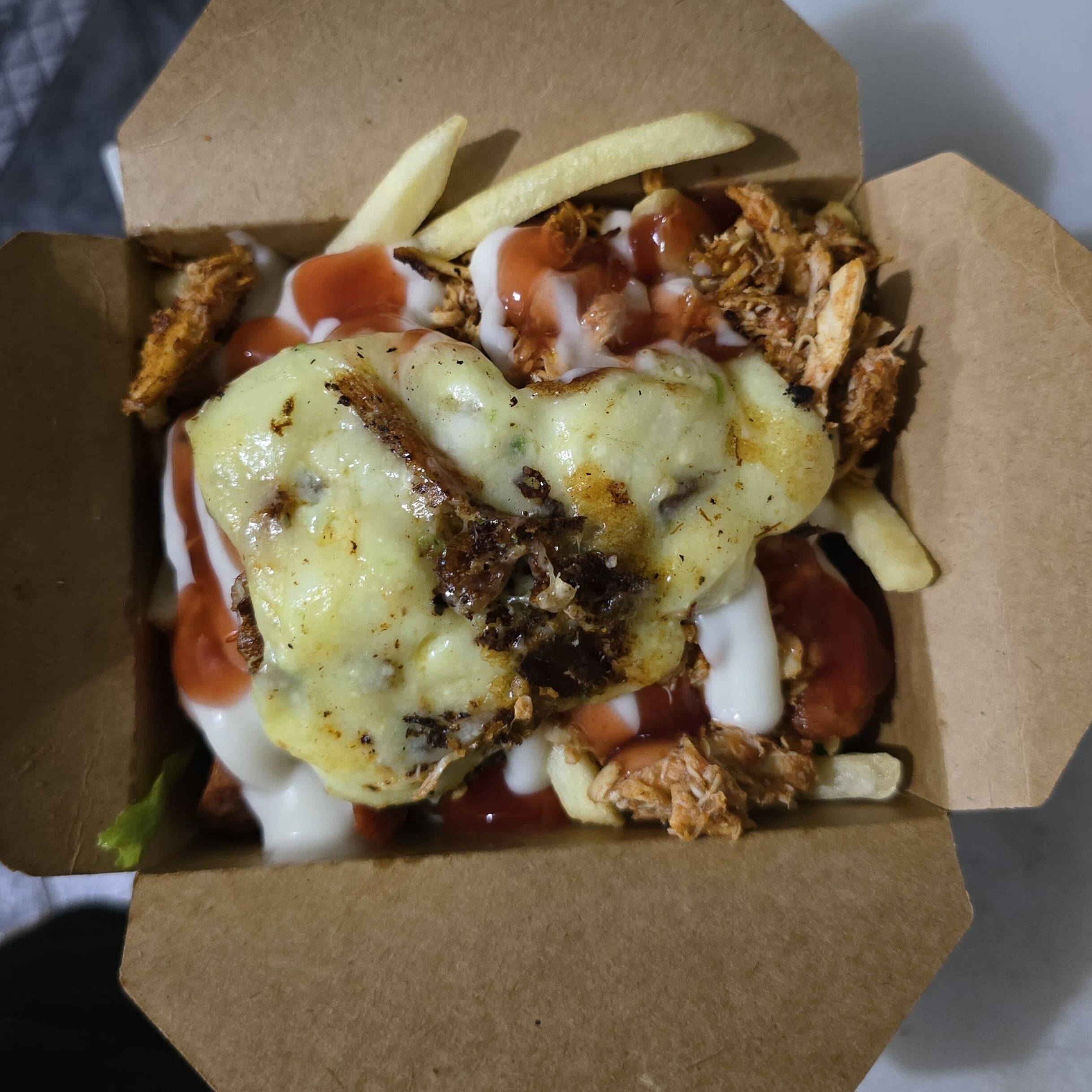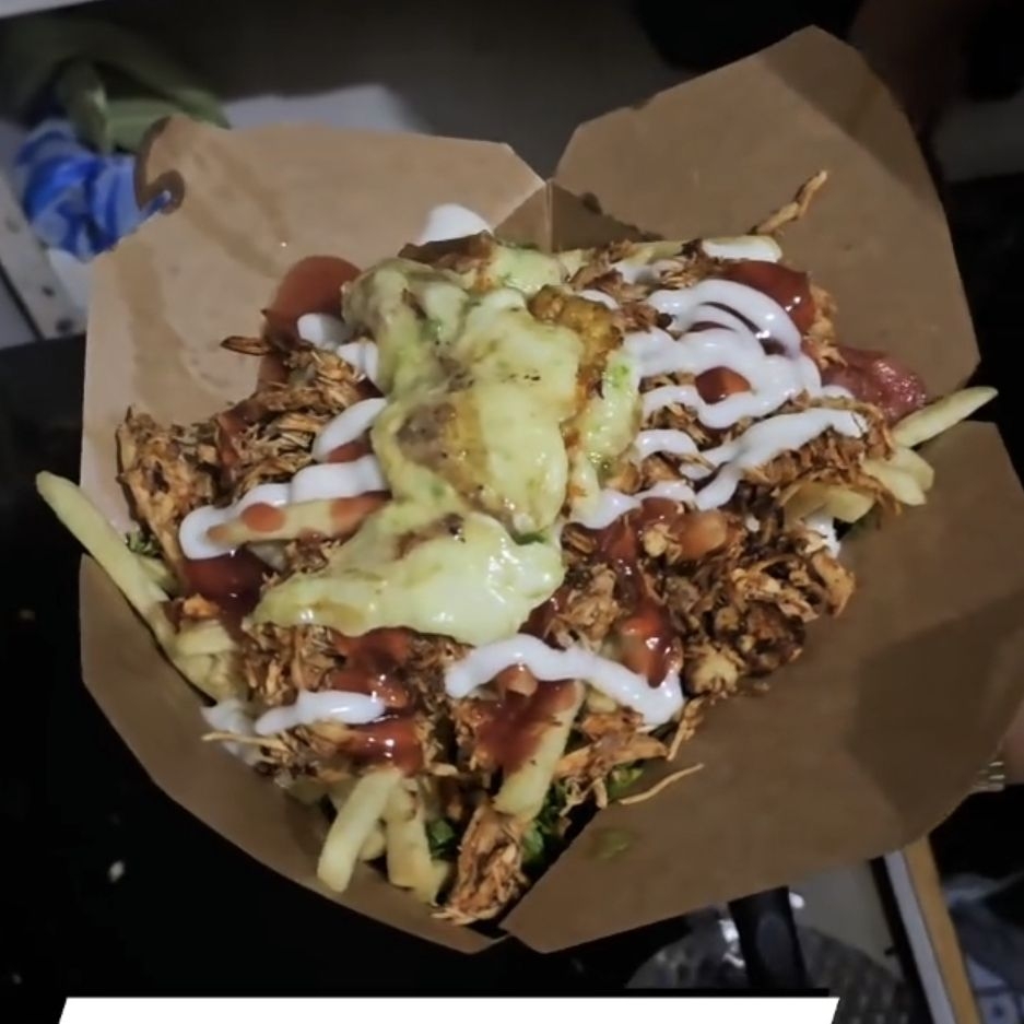 Papas fritas, salchichas, carne de res o pollo, lechuga, salsa de tomate, mayonesa y queso gratinado.